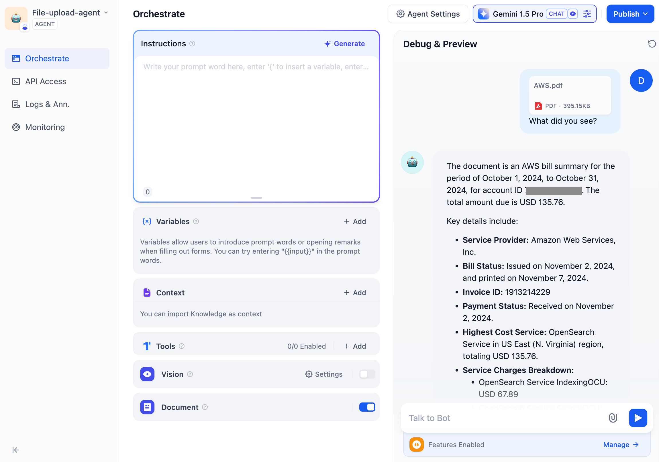 After orchestrating your Agent Assistant, you have the option to debug and preview it before publishing it as an application. This allows you to assess the effectiveness of the agent in completing tasks.