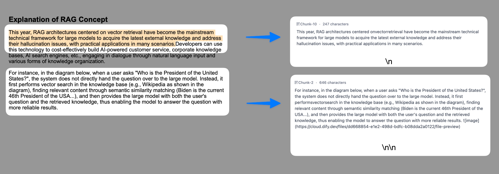 Content will be divided into independent chunks. When a user submits a query, the system automatically calculates the relevance between the chunks and the query keywords. The top-ranked chunks are then retrieved and sent to the LLM for processing the answers.