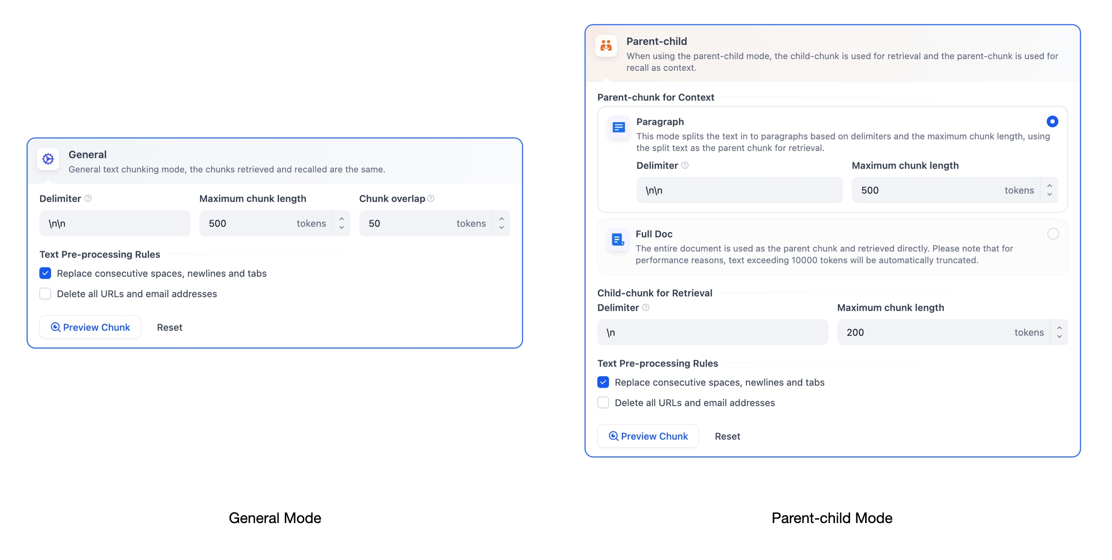 - Full Doc - Instead of splitting the text into paragraphs, the entire document is used as the parent chunk and retrieved directly. For performance reasons, only the first 10,000 tokens of the text are retained. This setting is ideal for smaller documents where paragraphs are interrelated, requiring full doc retrieval.