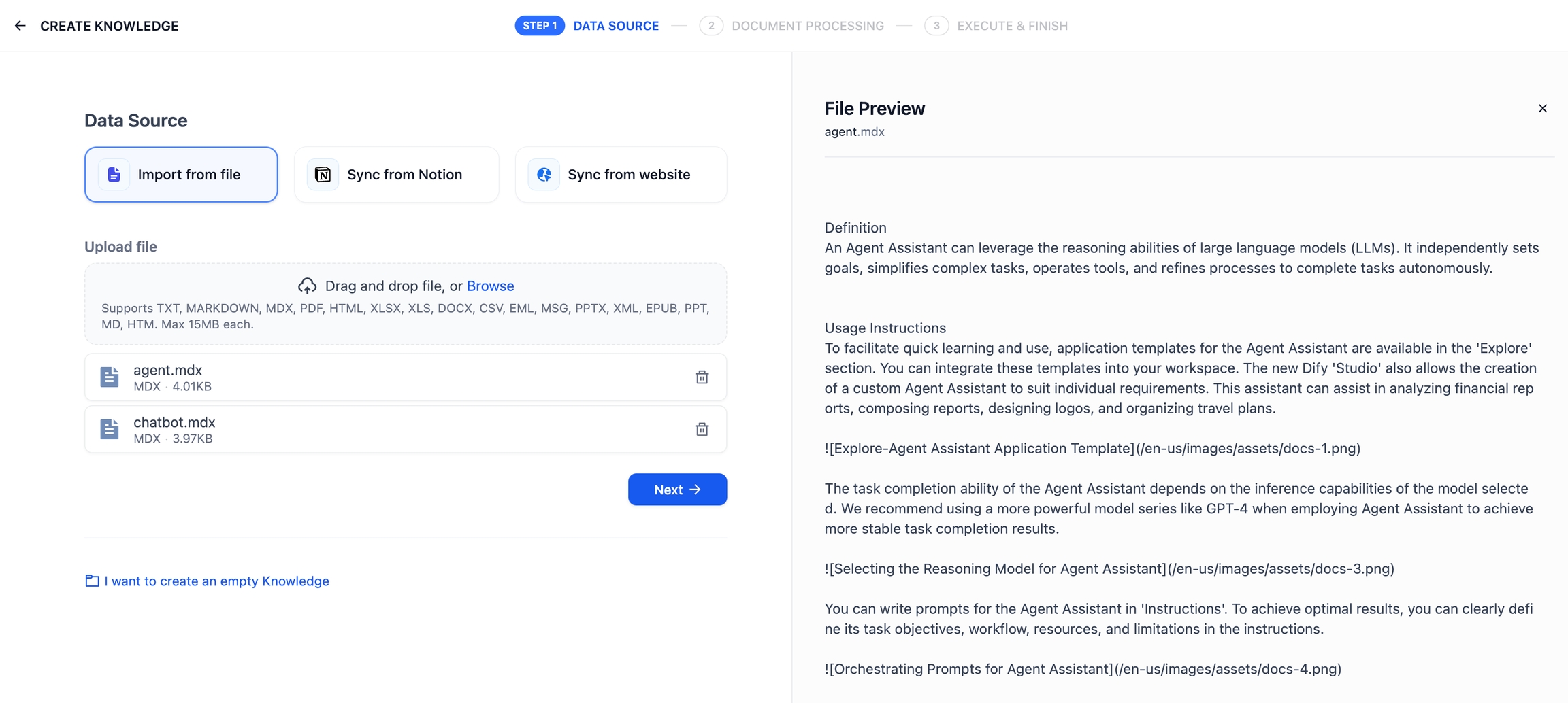 1.1 Import Data from Notion1.2 Import Data from WebsiteIf a knowledge base is set up to use online data, you won’t be able to add local documents later or switch it to a local file-based mode. This prevents a single knowledge base from mixing multiple data sources, avoiding management complications.