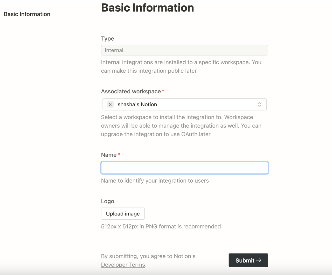First, create an integration in the integration settings page Create Integration. By default, all integrations start as internal integrations; internal integrations will be associated with the workspace you choose, so you need to be the workspace owner to create an integration.
