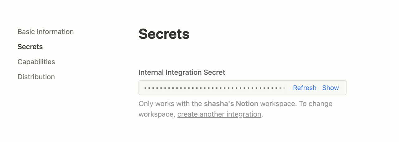 After creating the integration, you can update its settings as needed under the Capabilities tab and click the Show button under Secrets to copy the secrets.