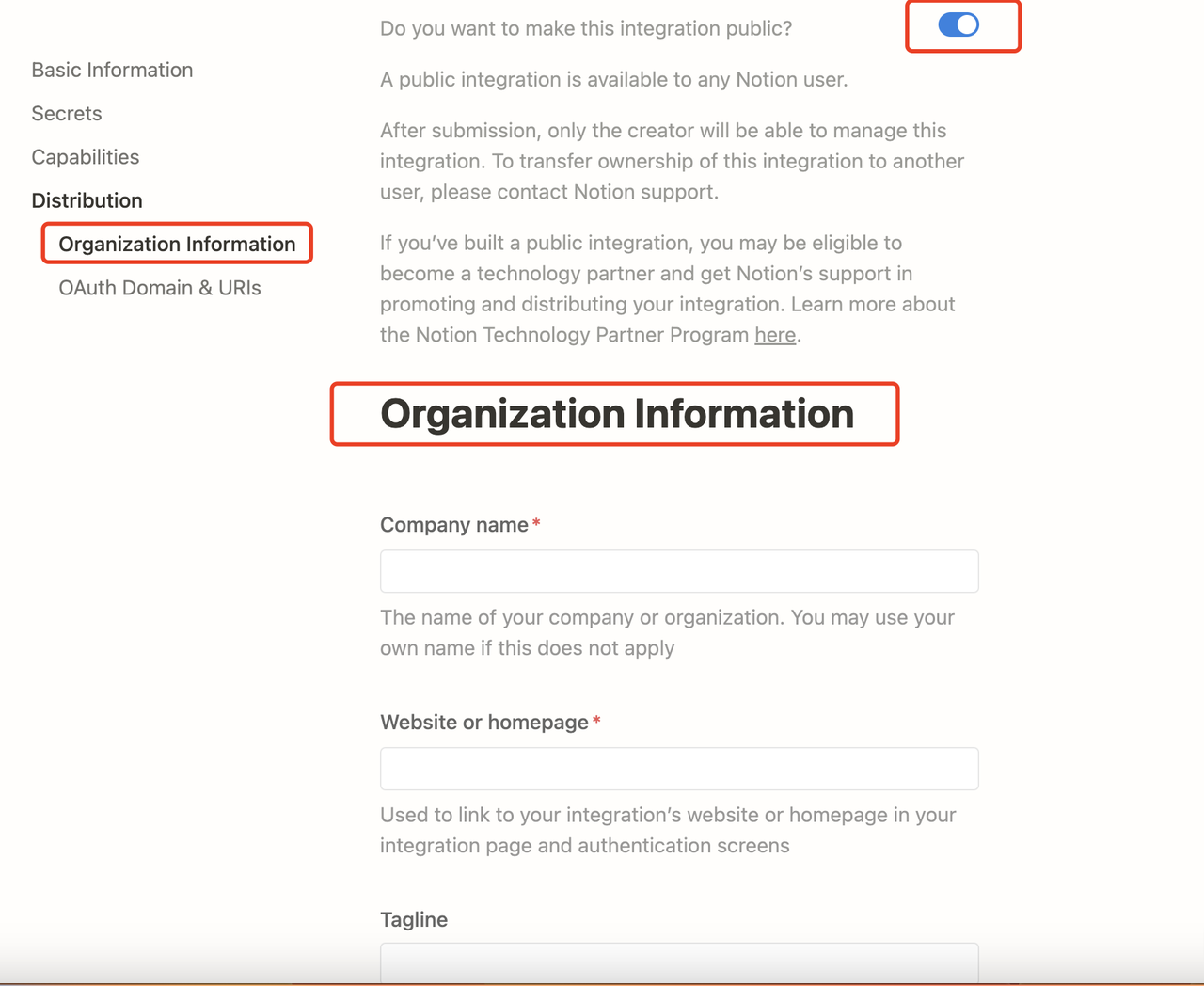 You need to upgrade the internal integration to a public integration. Navigate to the Distribution page of the integration, and toggle the switch to make the integration public. When switching to the public setting, you need to fill in additional information in the Organization Information form below, including your company name, website, and redirect URL, then click the Submit button.