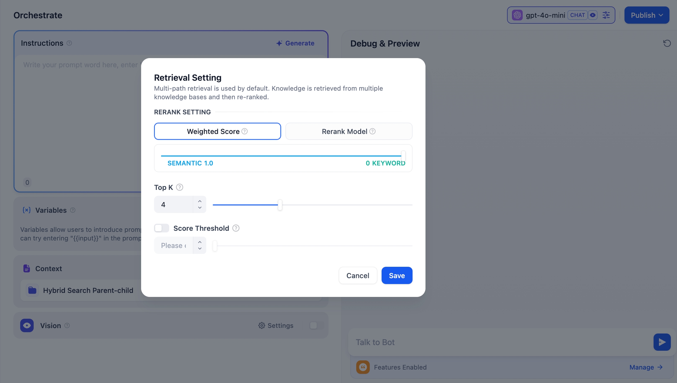 In addition to enabling only semantic or keyword retrieval modes, we offer flexible custom Weight Score. You can determine the best weight ratio for your business scenario by continuously adjusting the weights of both.
