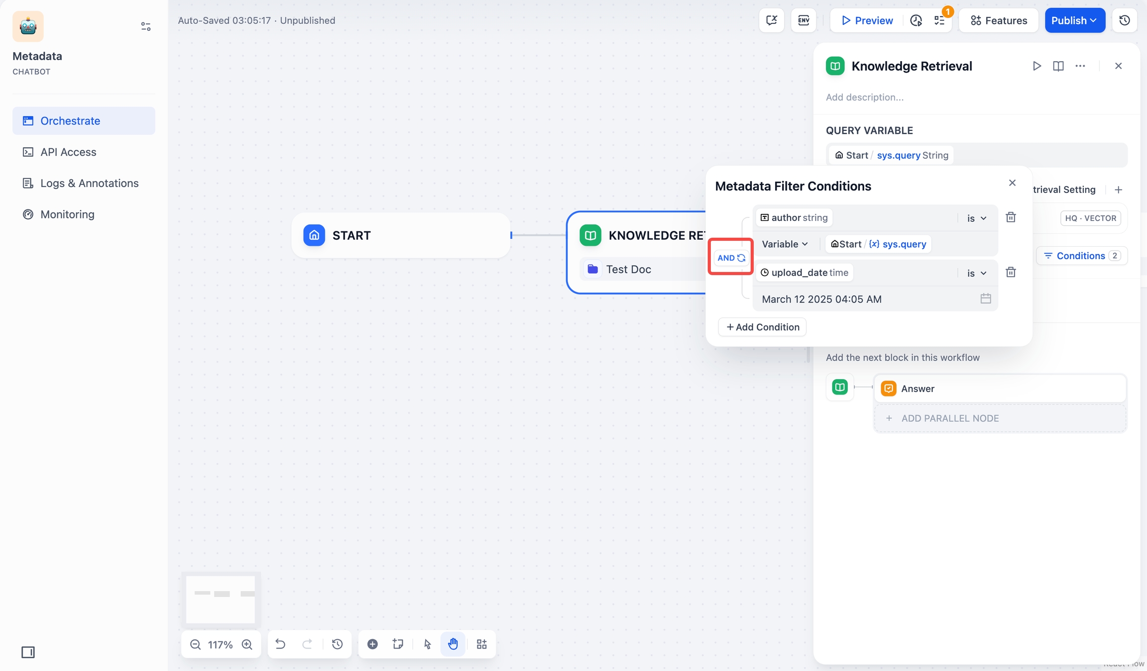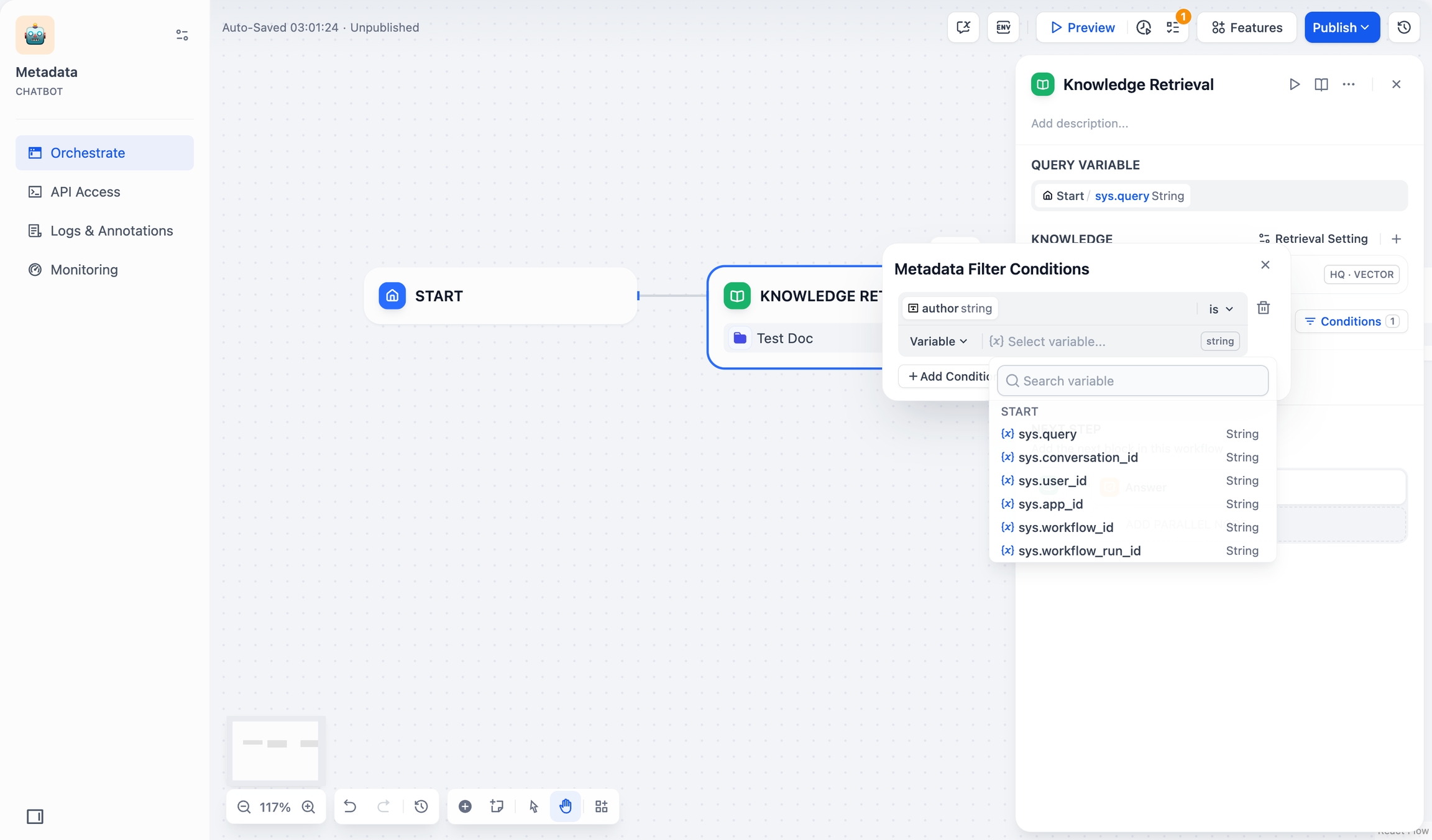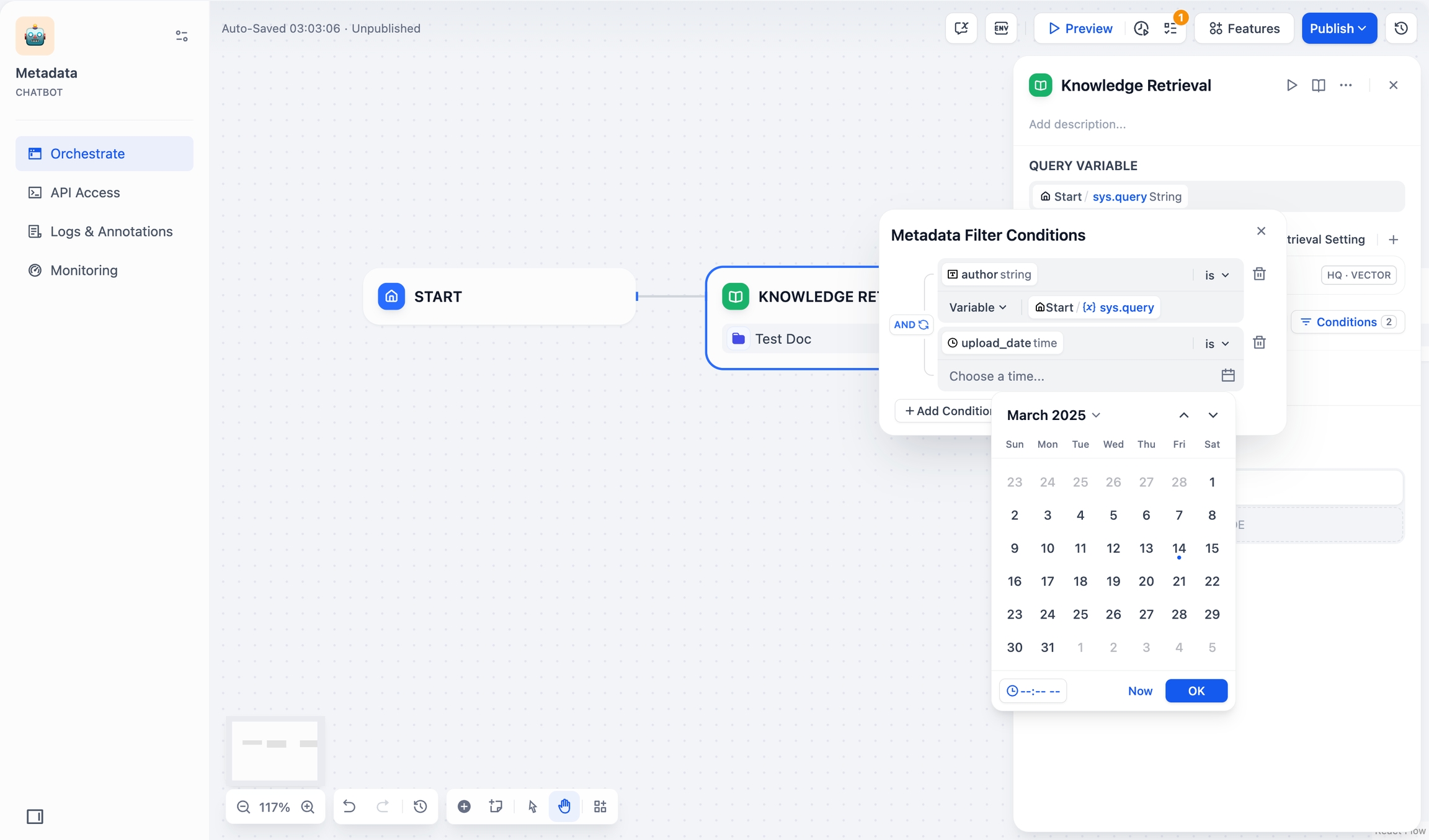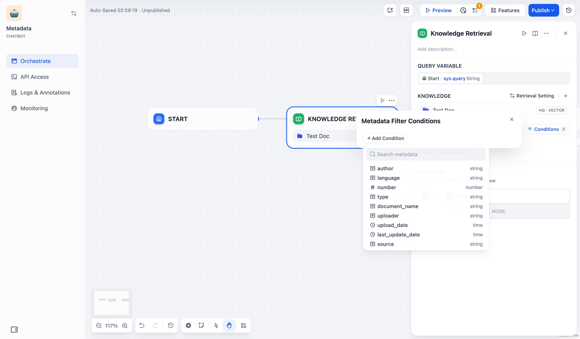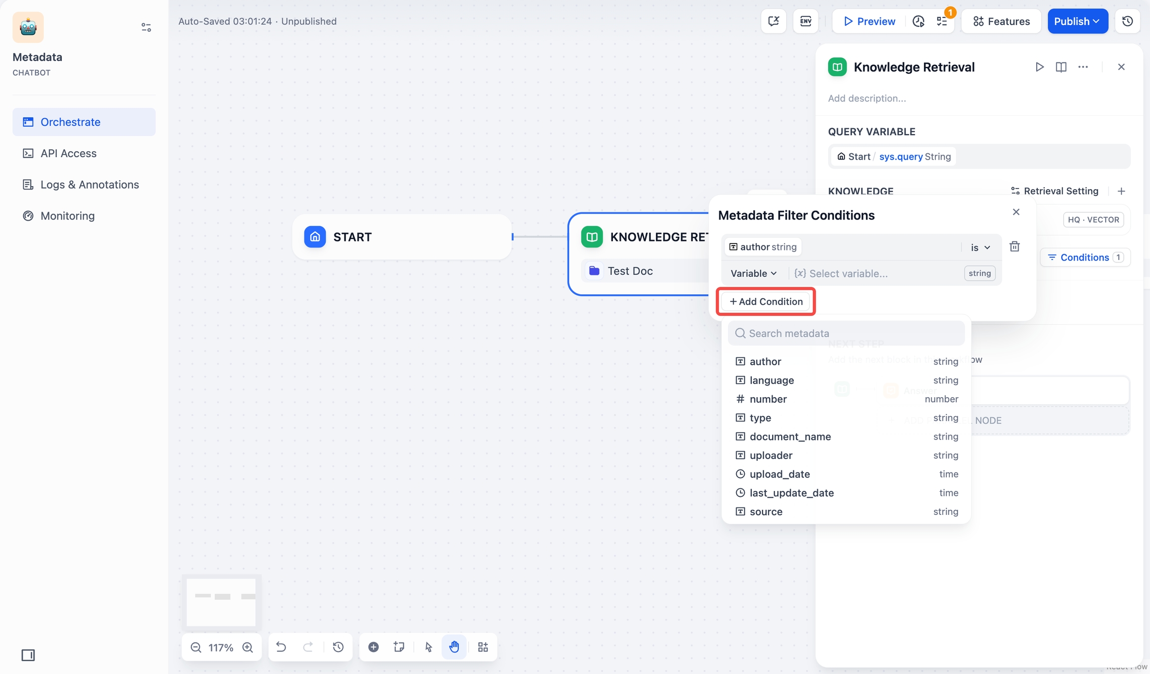 The Knowledge Retrieval node allows you to filter documents using metadata fields.