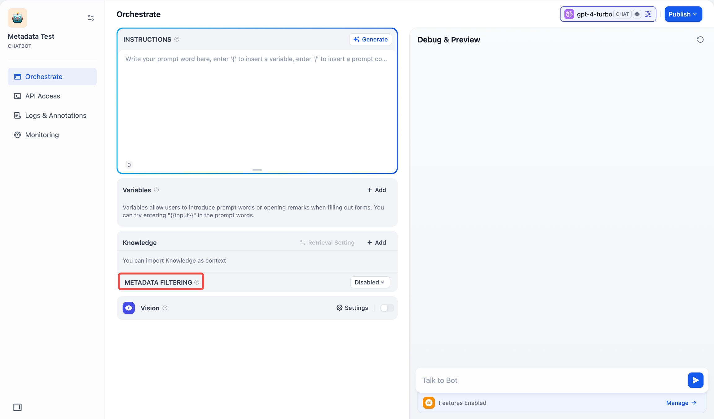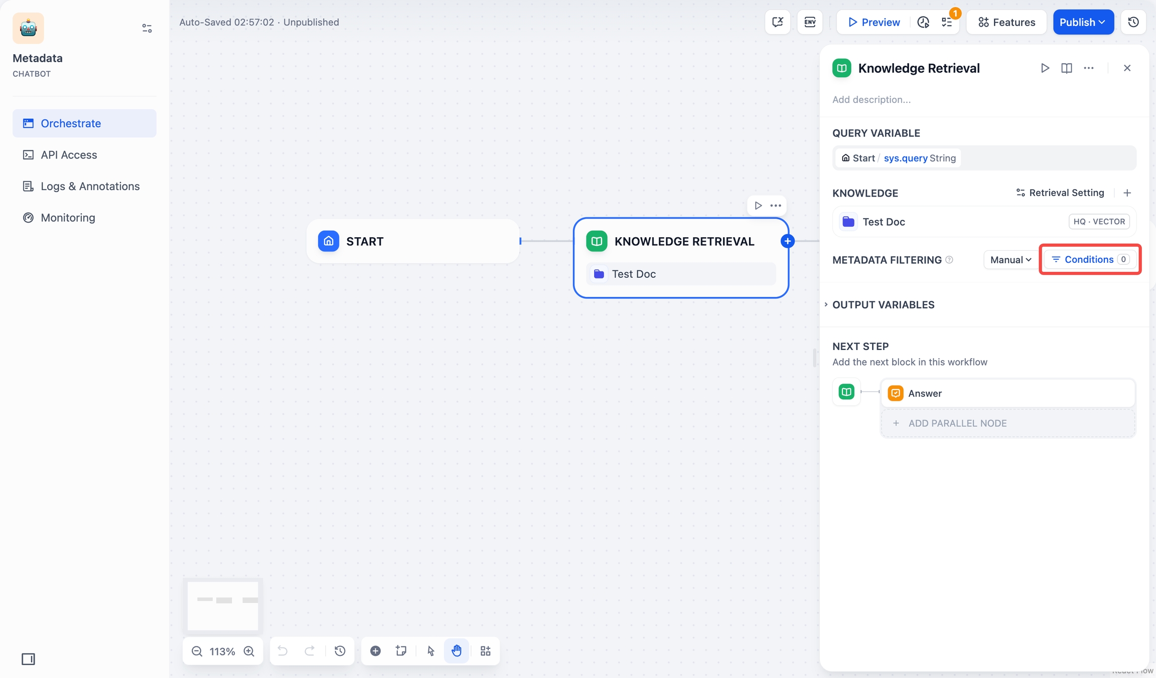Access Metadata Filtering below Knowledge (bottom-left). Configuration steps are the same as in Chatflow/Workflow.