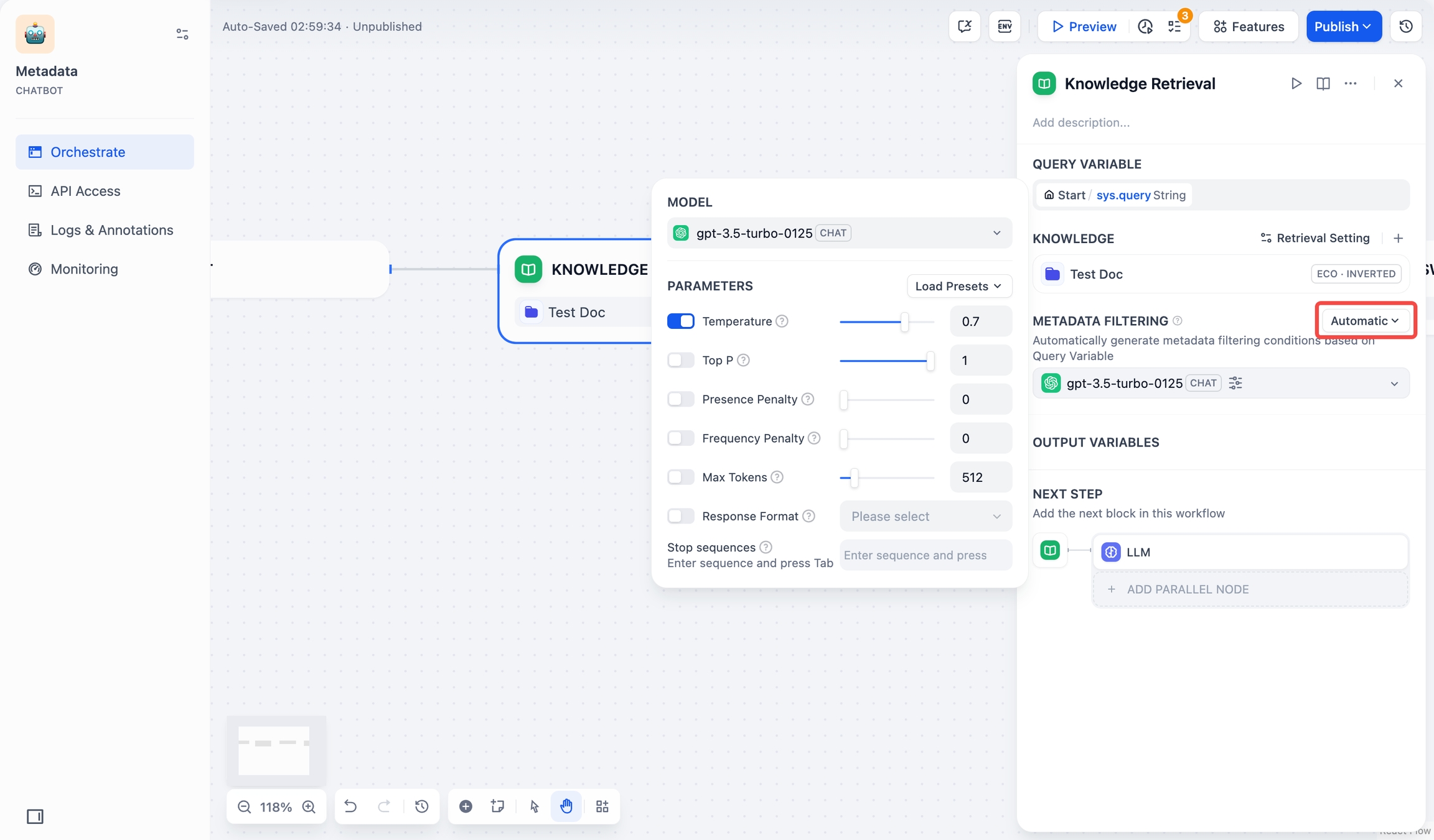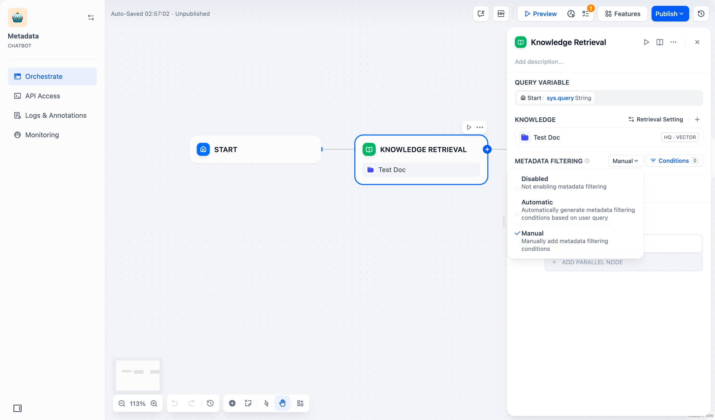 Automatic: Filters auto-configure from query variables in the Knowledge Retrieval node.