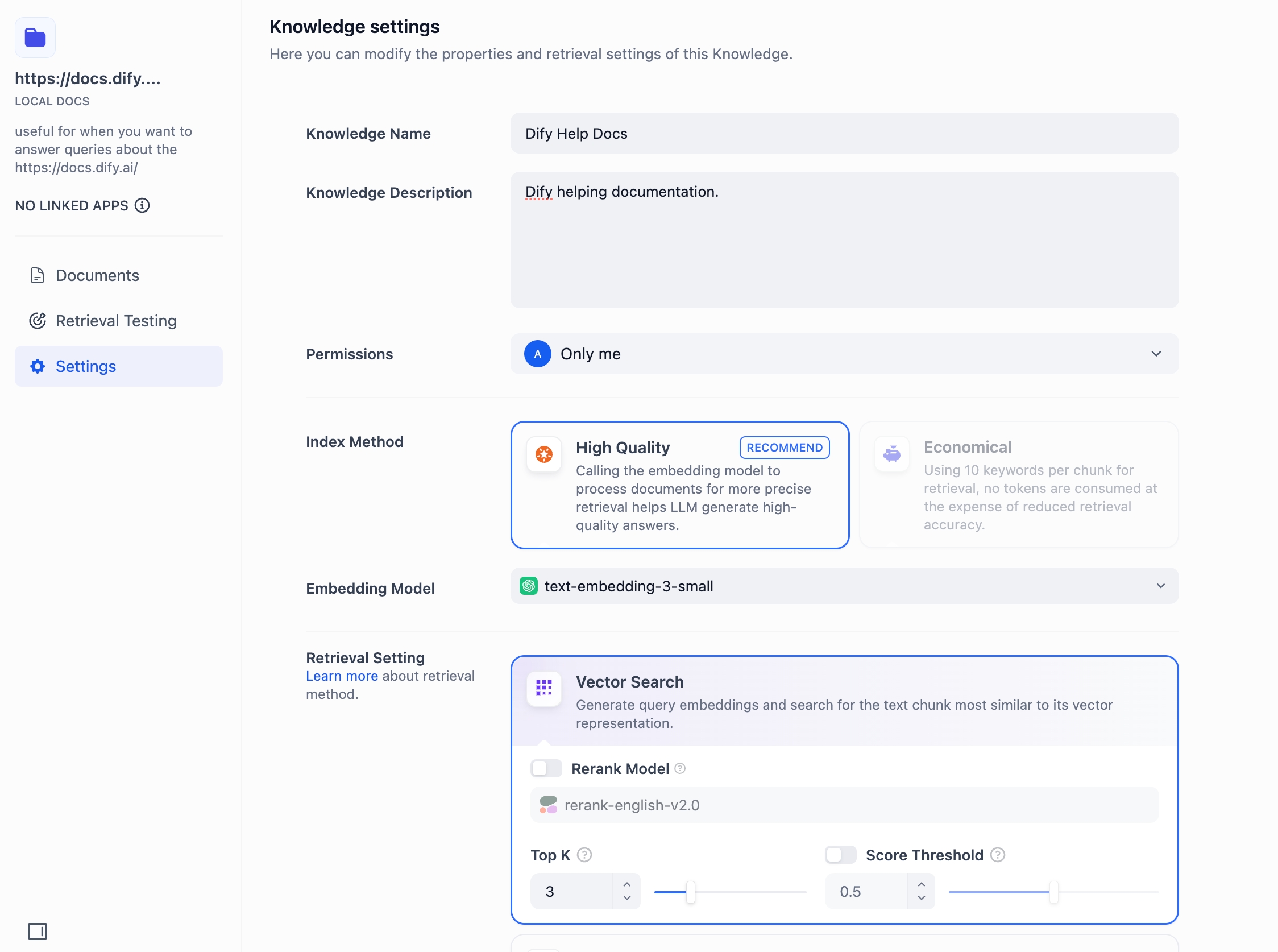 - Retrieval Settings: For detailed explanations, please refer to the documentation.