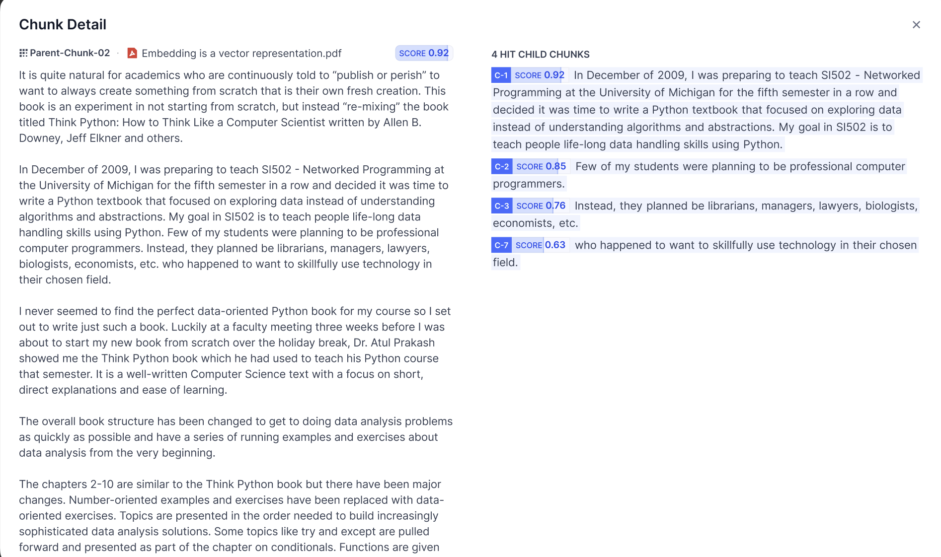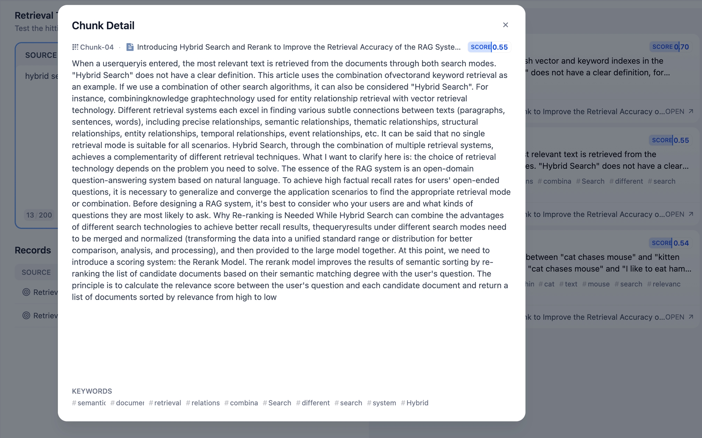 In General Mode, each text chunk stands independently. The score shown in the top-right corner of a chunk represents how closely it matches the query keywords. A higher score indicates a stronger alignment between the chunk and the keywords.