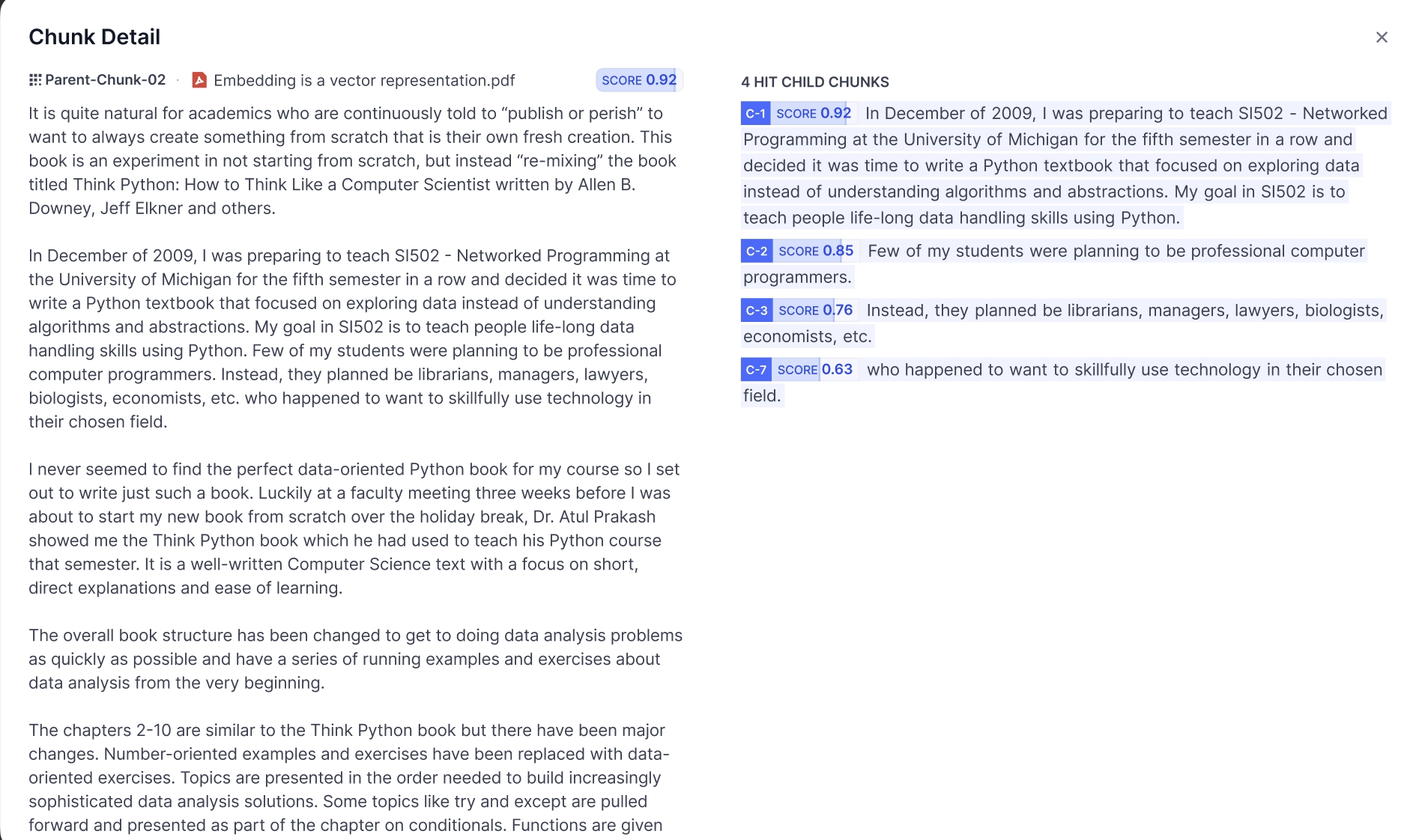You can click a child chunk to preview its exact content. After the match, the entire parent chunk is recalled to provide more comprehensive information.