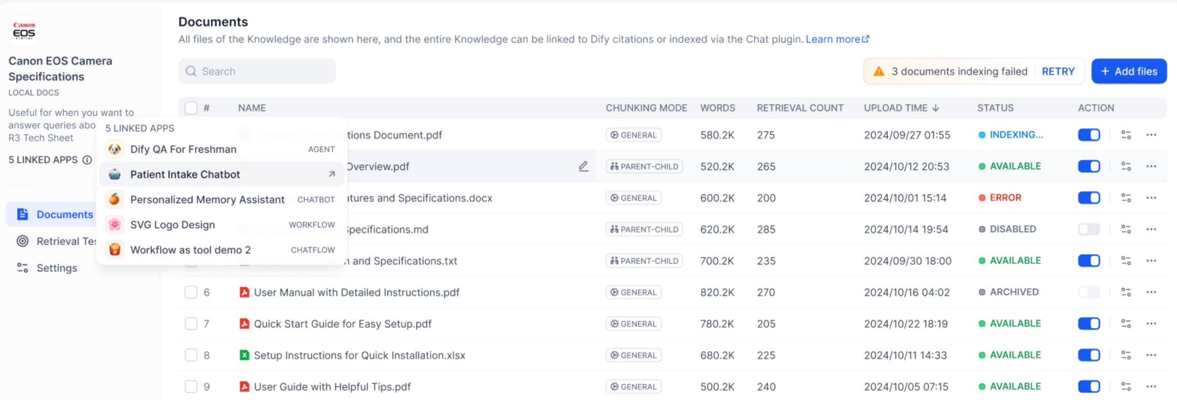 Dify’s knowledge base provides a text retrieval testing feature, allowing you to simulate user queries and retrieve knowledge base content blocks. The retrieval chunks are sorted by score and then sent to the LLM. Generally, the higher the match between the question and the content chunks, the more closely the LLM’s answer will align with the source document, leading to better “training results.”