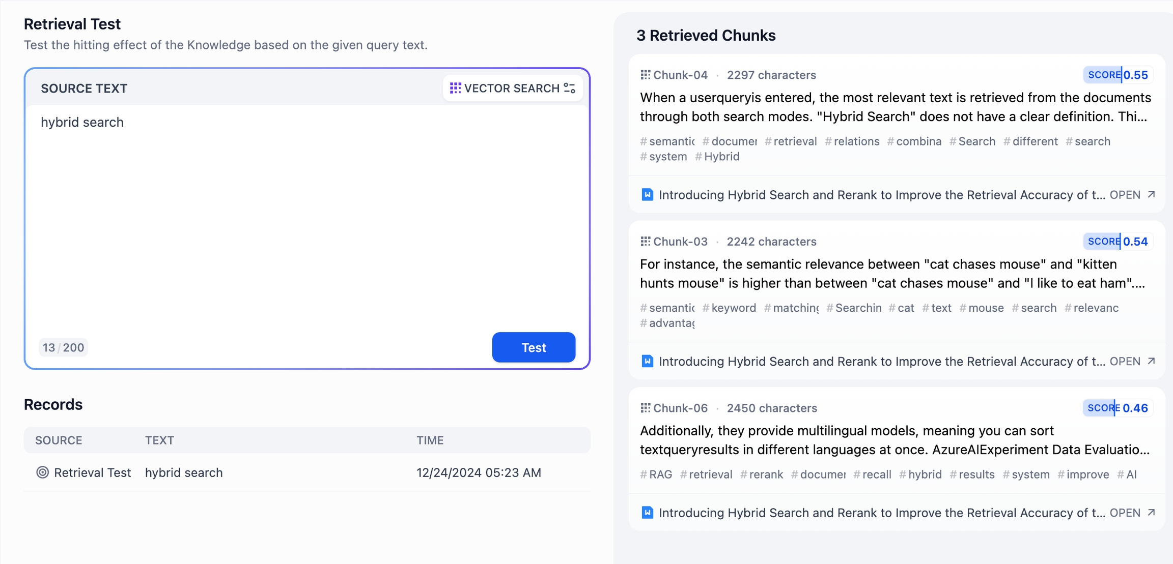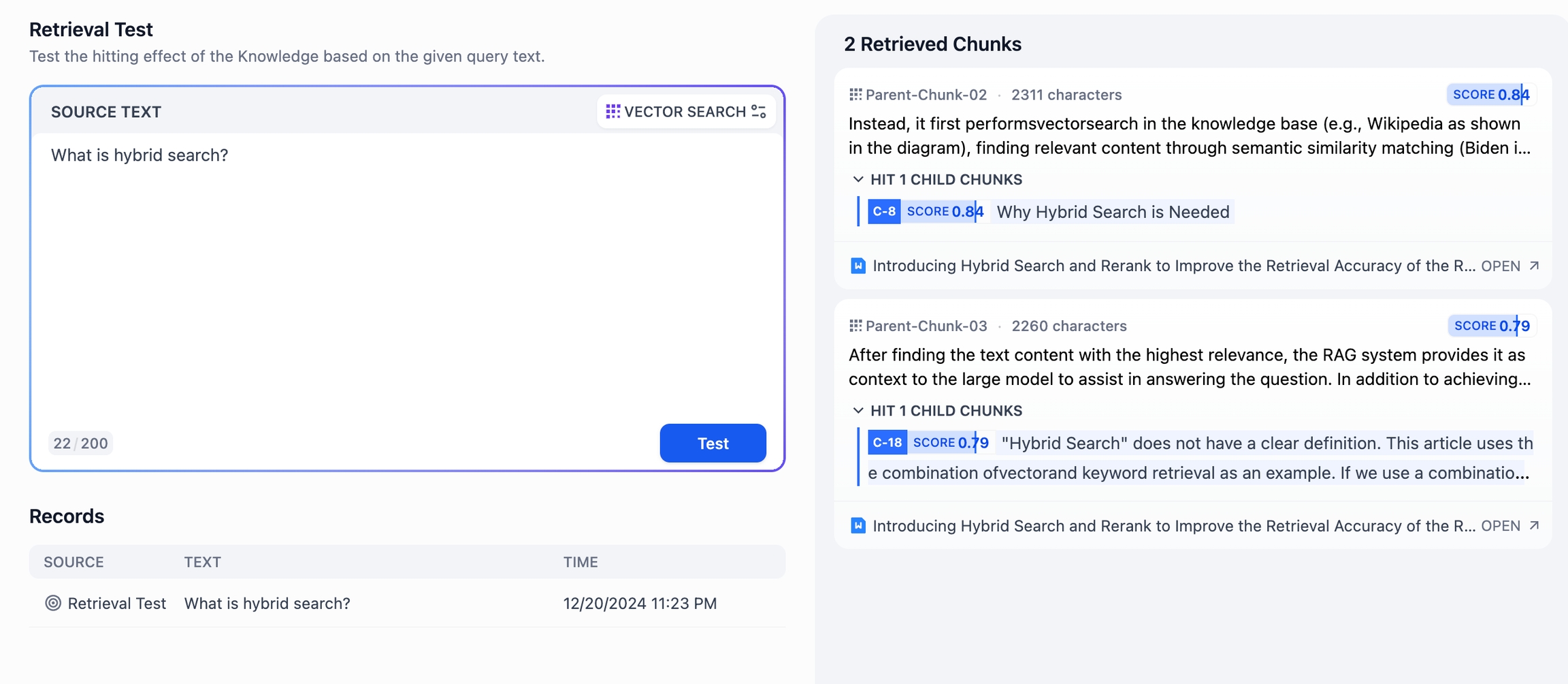 Each chunk displays its source document at the bottom—usually a specific paragraph or sentence. Tap the “Open” button on the right side of the source to view the entire referenced content chunk. Since multiple child chunks can be relevant, this allows you to assess whether the current chunk is appropriate.
