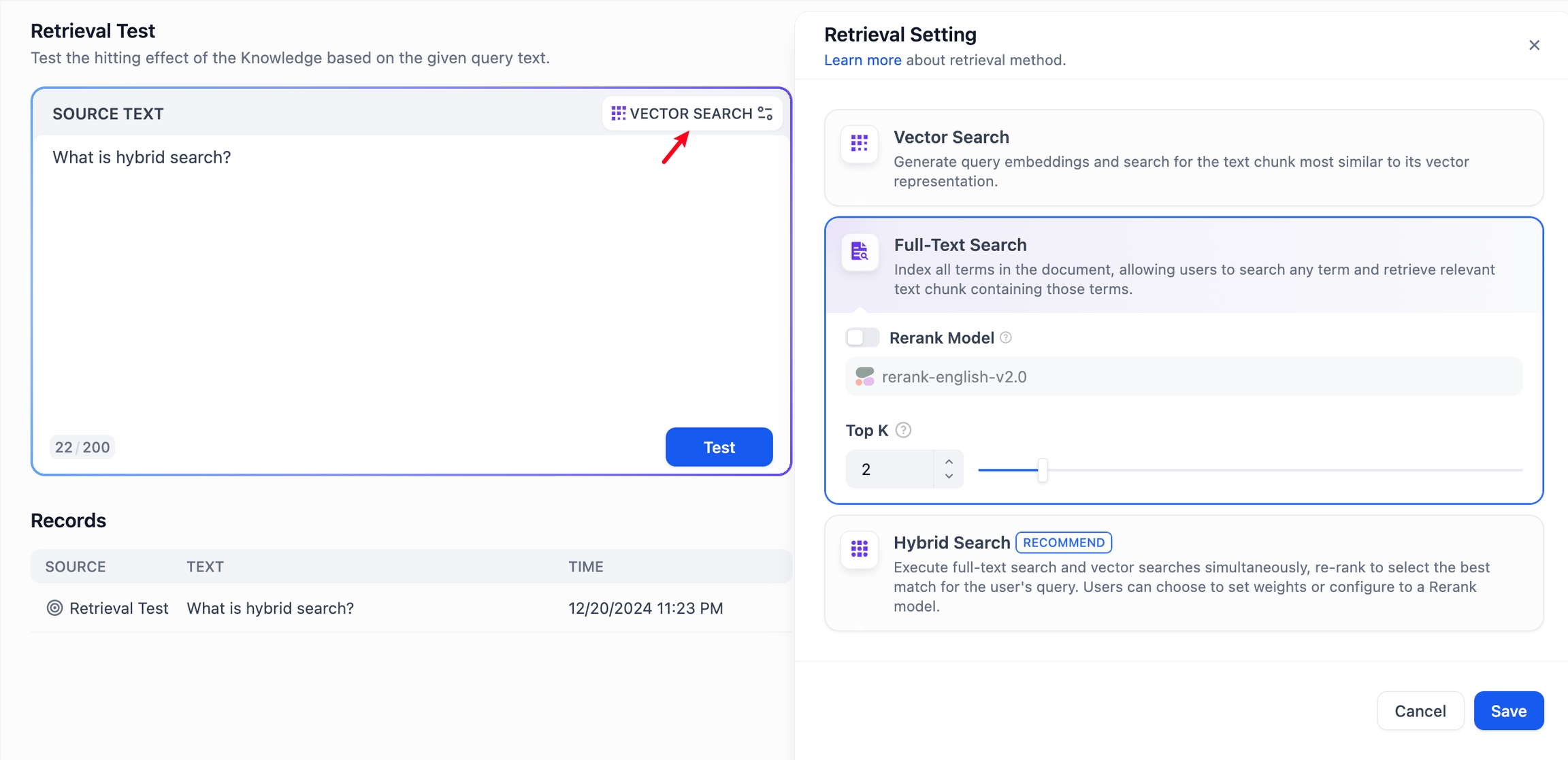 Choose an appropriate retrieval strategy: vector search/full-text search/hybrid search. For the pros and cons of different retrieval methods, please refer to the extended reading Retrieval-Augmented Generation (RAG).