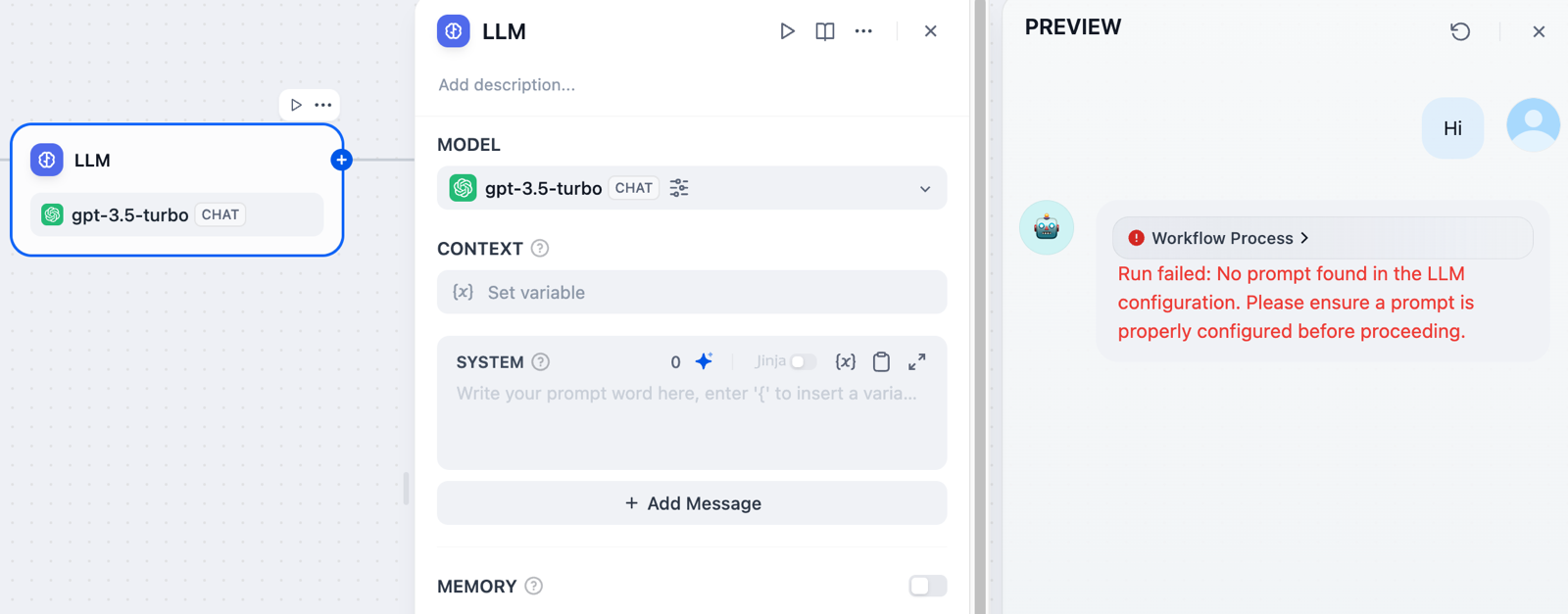 Each LLM node requires a configured model. This error occurs when no model is selected.
