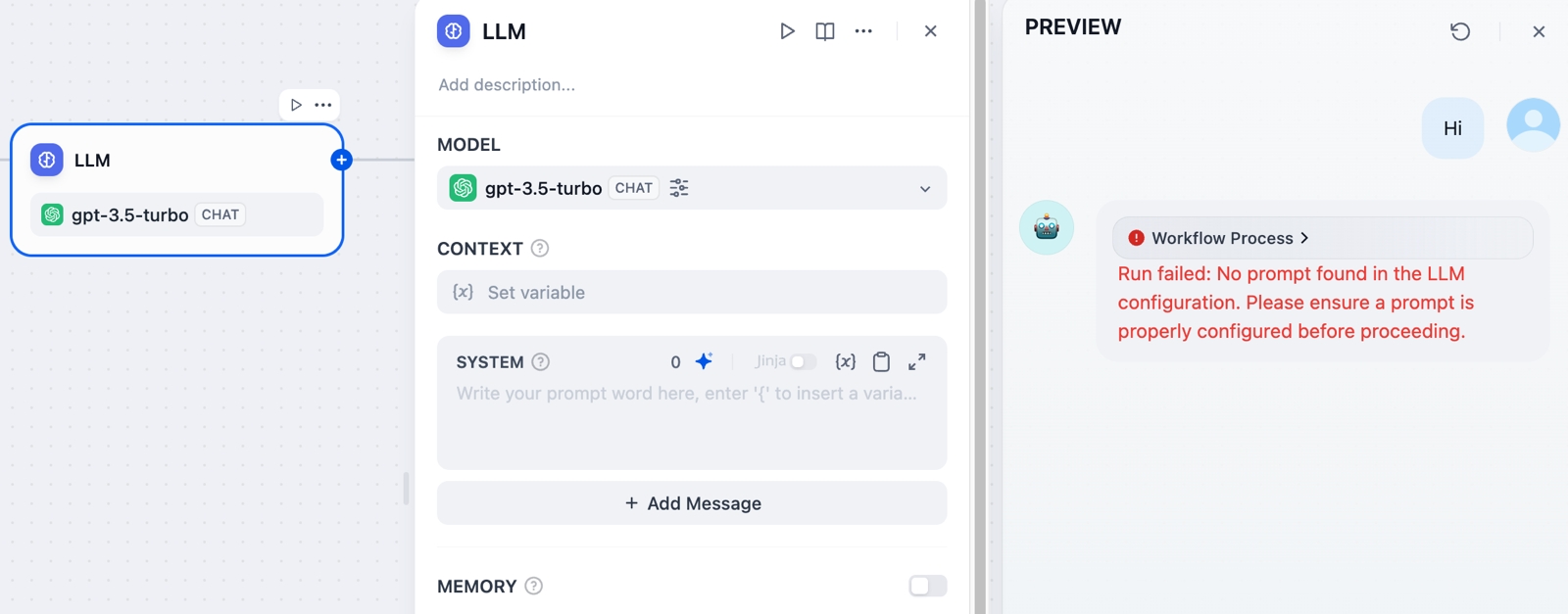 - No Prompt Found Error (NoPromptFoundError) - An error occurs when the LLM node's prompt is empty, as prompts cannot be blank.