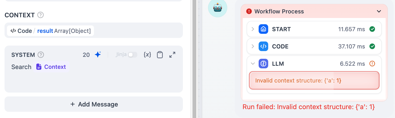 An error occurs when the context within the LLM node receives an invalid data structure (such as
