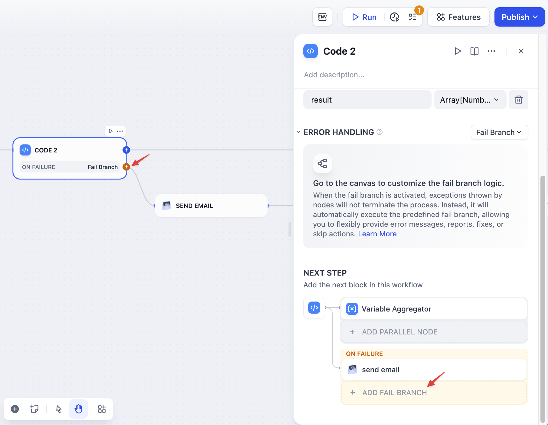 If the current node encounters an error, it triggers the predefined fail branch. When you select the fail branch option, new connection points are provided for the node, allowing developers to continue designing the workflow or add downstream nodes by clicking the bottom-right corner of the node details.
