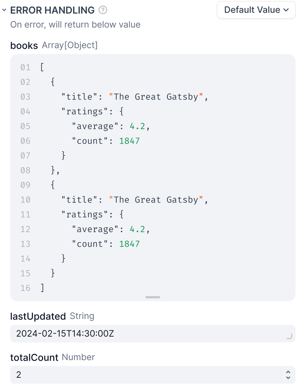 • Default value: Developers can predefine an alternative output for the node. If an error occurs, the workflow throws the predefined value instead of the node’s original error output, allowing the workflow process to continue seamlessly.
