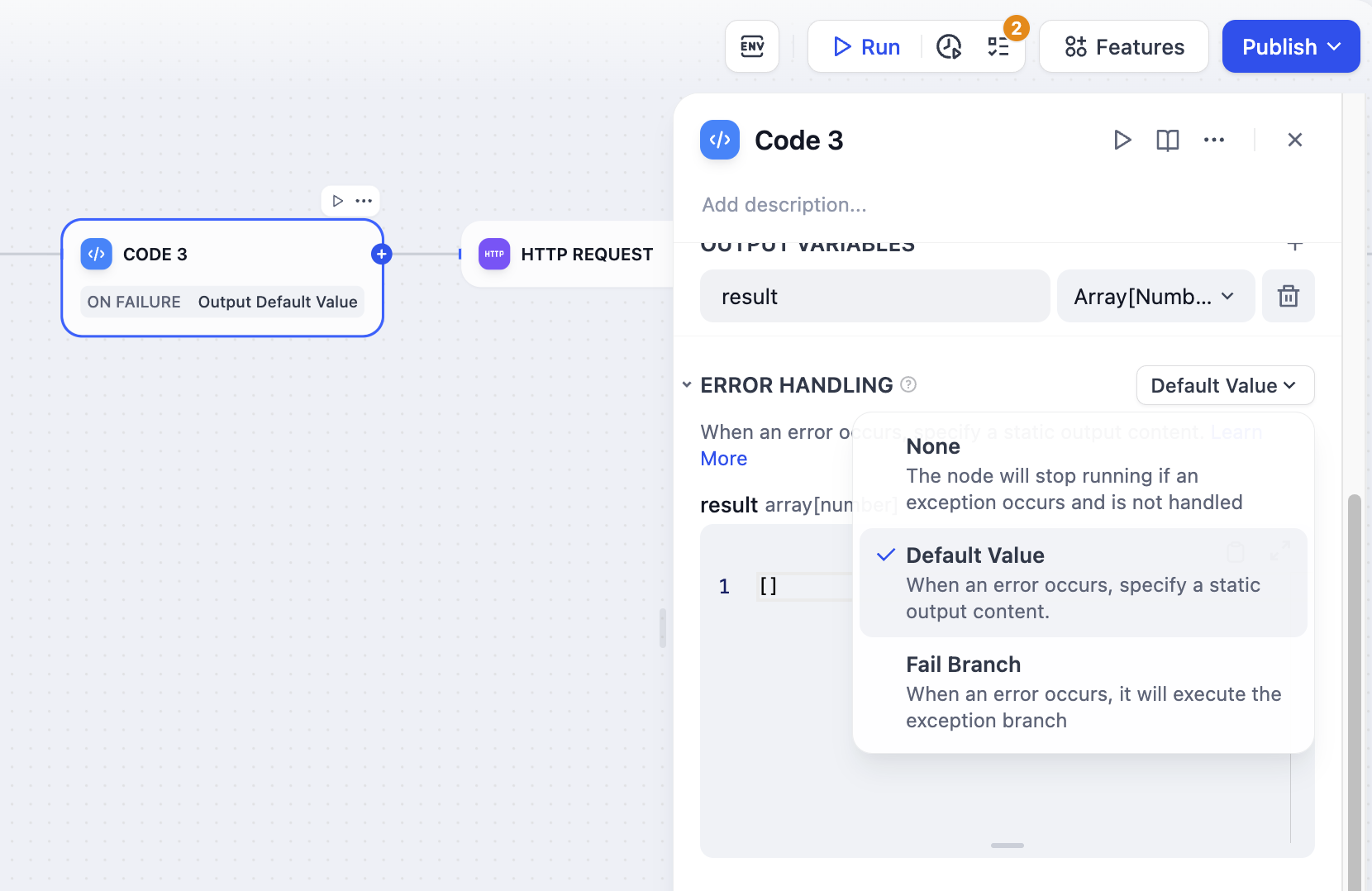 When processing information, code nodes may encounter code execution exceptions. Developers can follow these steps to configure fail branches, enabling contingency plans when nodes encounter exceptions, thus avoiding workflow interruptions.