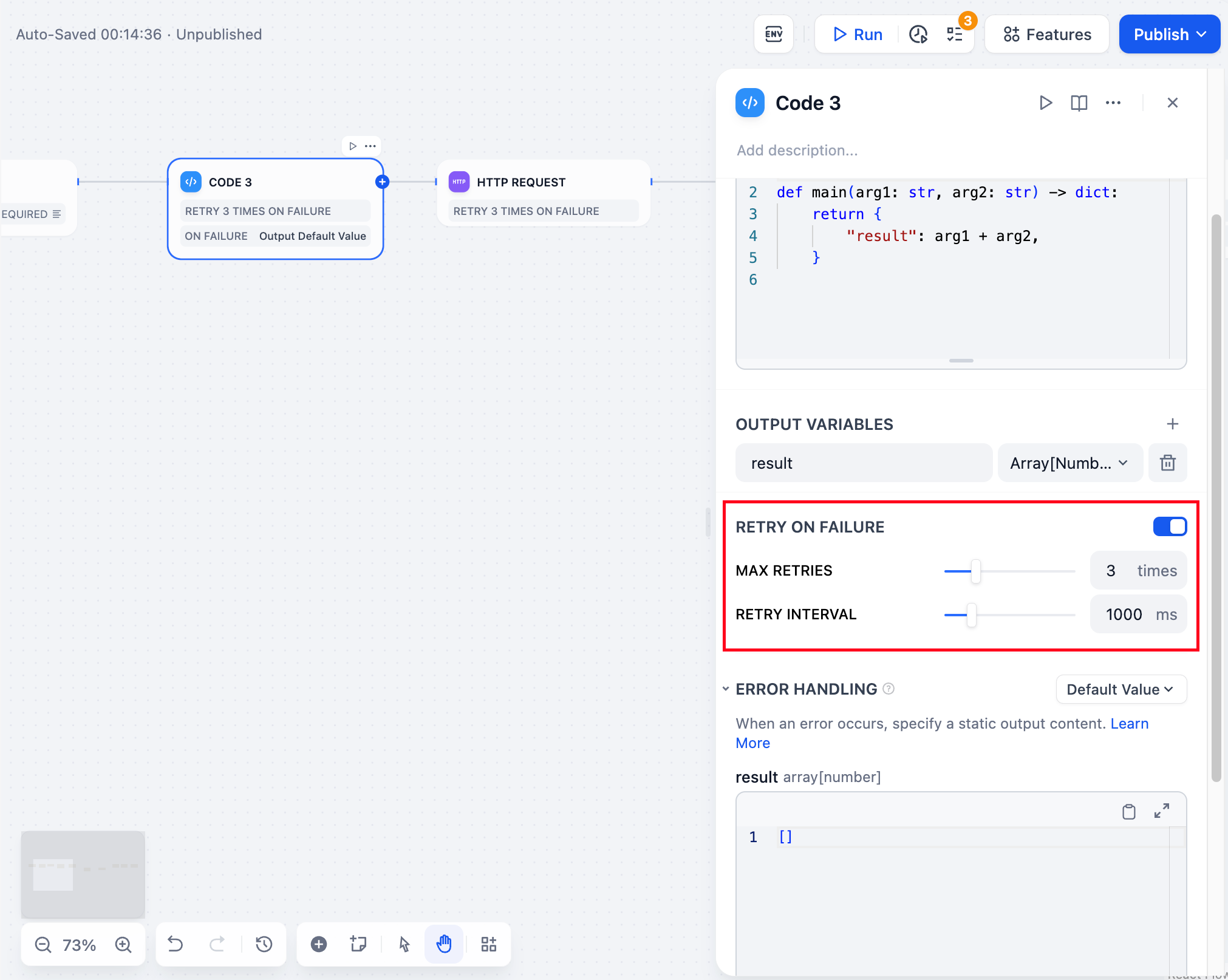 For some exceptions that occur in the node, it is usually sufficient to retry the node again. When the error retry function is enabled, the node will automatically retry according to the preset strategy when an error occurs. You can adjust the maximum number of retries and the interval between each retry to set the retry strategy.