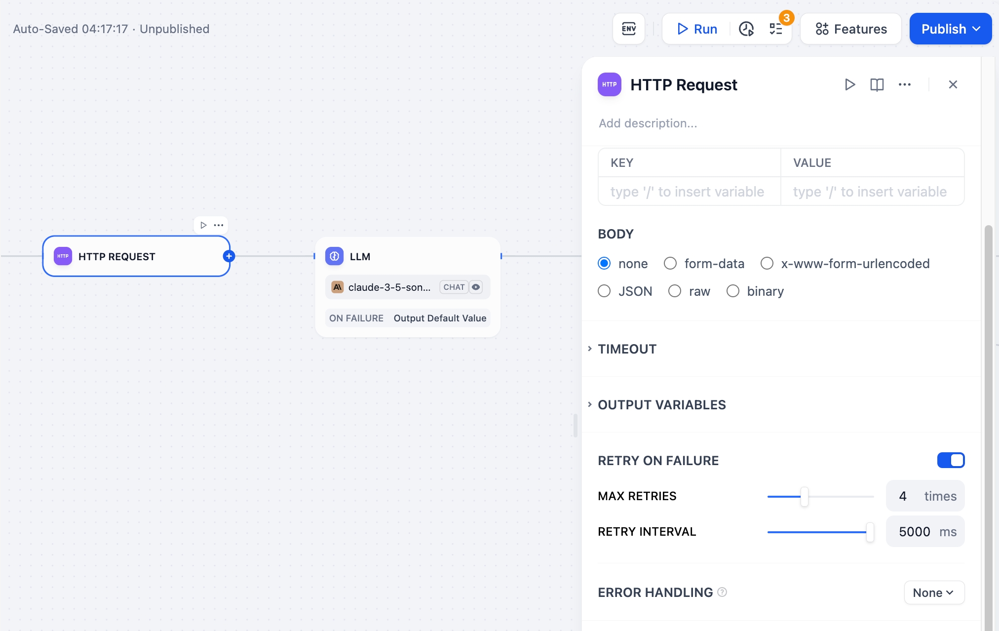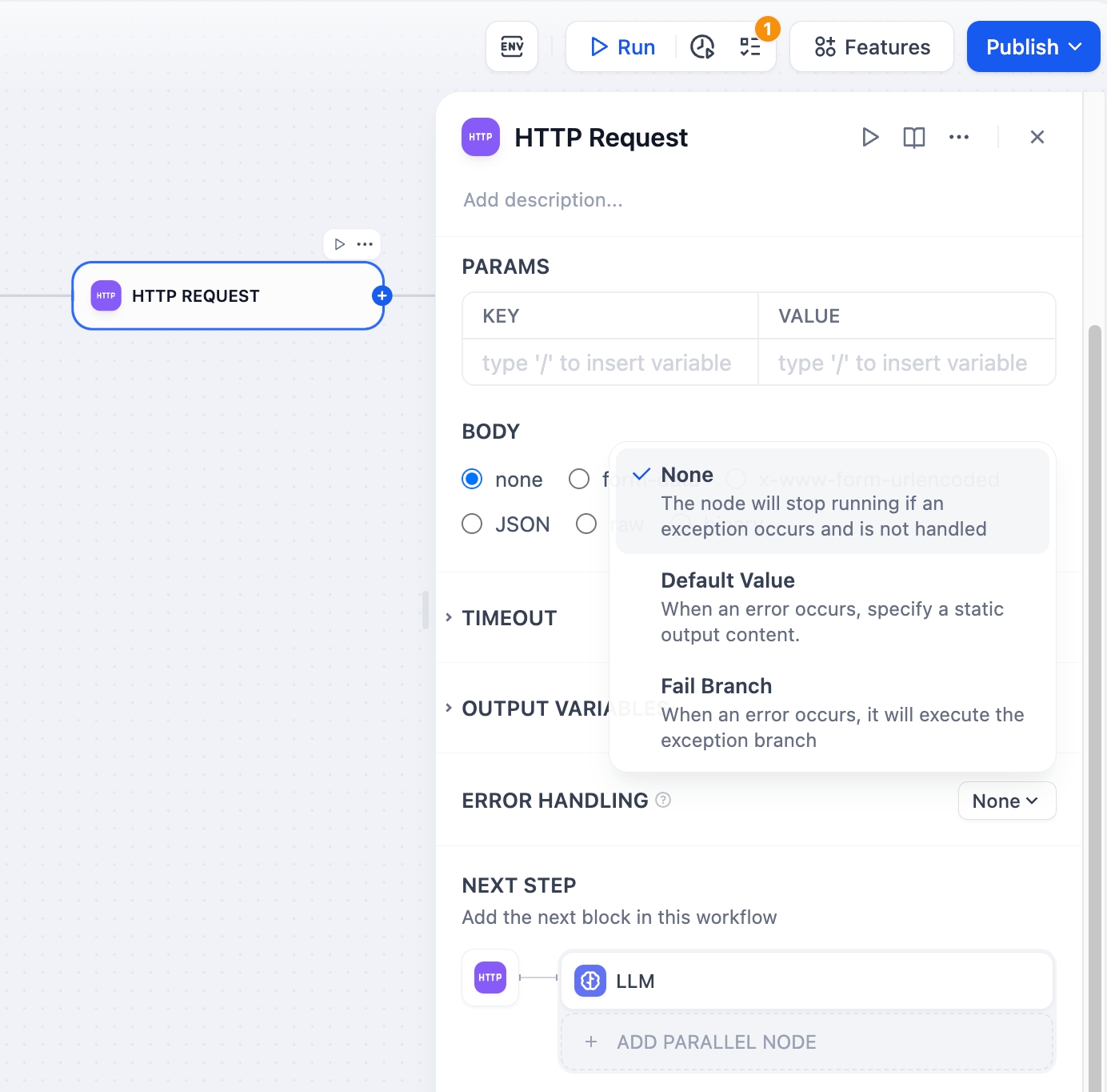 When processing information, HTTP nodes may encounter exceptional situations such as network request timeouts or request limits. Application developers can follow these steps to configure fail branches, enabling contingency plans when nodes encounter exceptions and avoiding workflow interruptions.