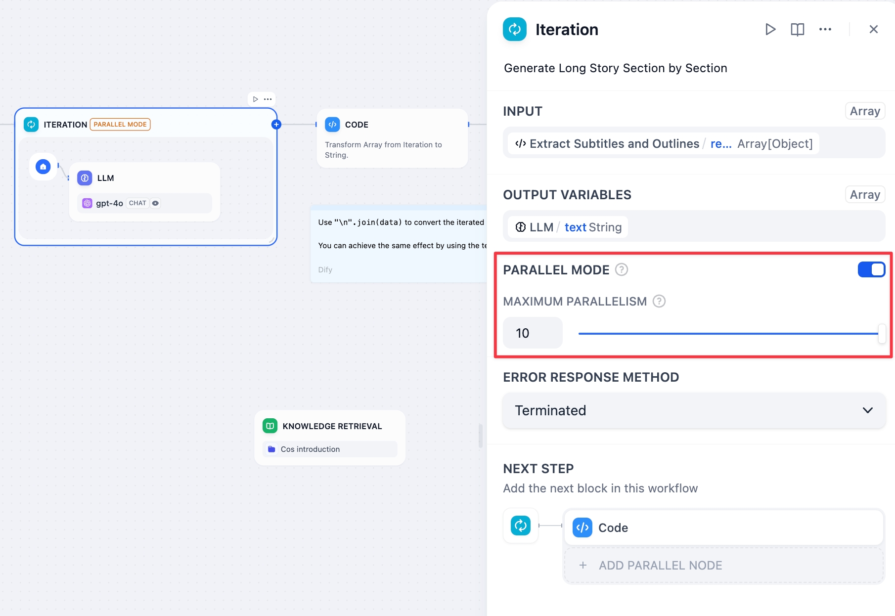 The iteration node supports parallel processing, improving execution efficiency when enabled.