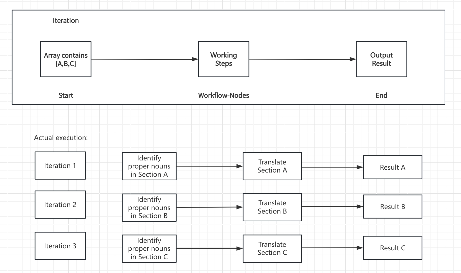 Using iteration nodes requires input values to be formatted as list objects. The node sequentially processes all elements in the array variable from the iteration start node, applying identical processing steps to each element. Each processing cycle is called an iteration, culminating in the final output.