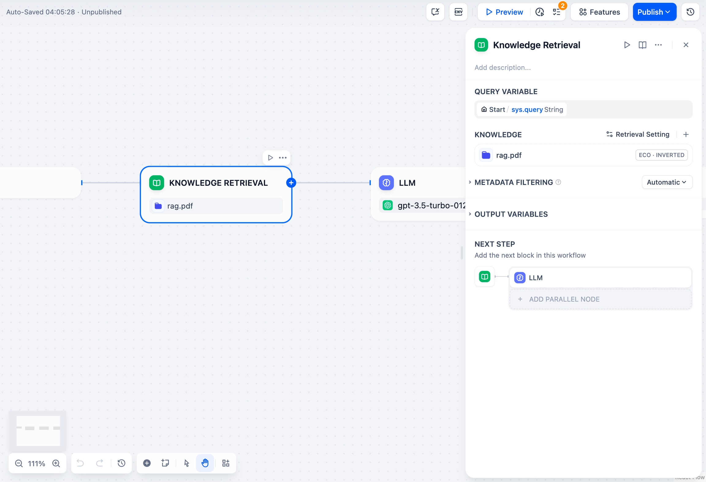 In knowledge base retrieval scenarios, the query variable typically represents the user's input question. In the "Start" node of conversational applications, the system pre-sets "sys.query" as the user input variable. This variable can be used to query the knowledge base for text chunks most closely related to the user's question. The maximum query content sent to the knowledge base is 200 characters.