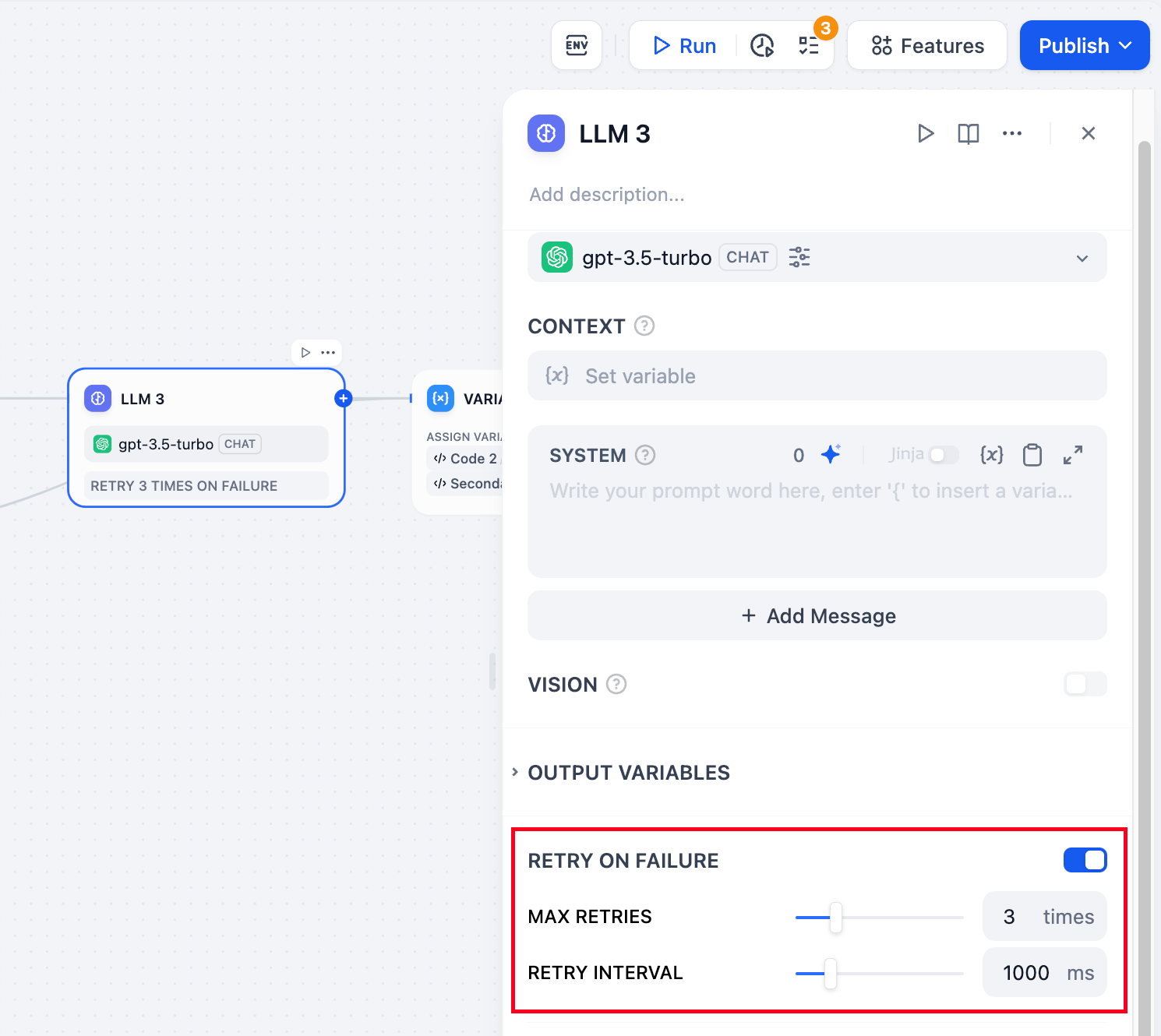 Retry on Failure: For some exceptions that occur in the node, it is usually sufficient to retry the node again. When the error retry function is enabled, the node will automatically retry according to the preset strategy when an error occurs. You can adjust the maximum number of retries and the interval between each retry to set the retry strategy.