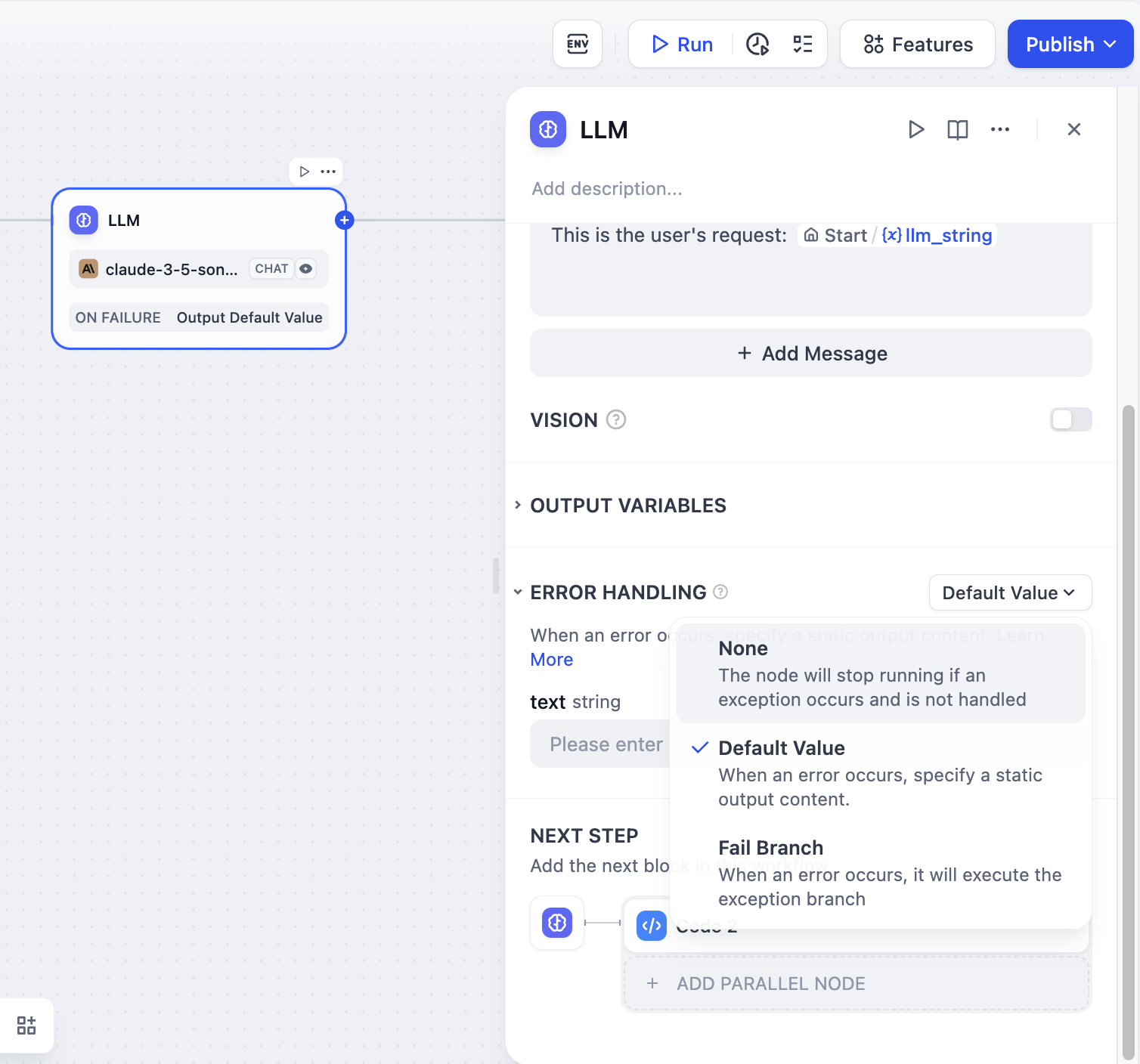 When processing information, LLM nodes may encounter errors such as input text exceeding token limits or missing key parameters. Developers can follow these steps to configure exception branches, enabling contingency plans when node errors occur to avoid interrupting the entire flow: