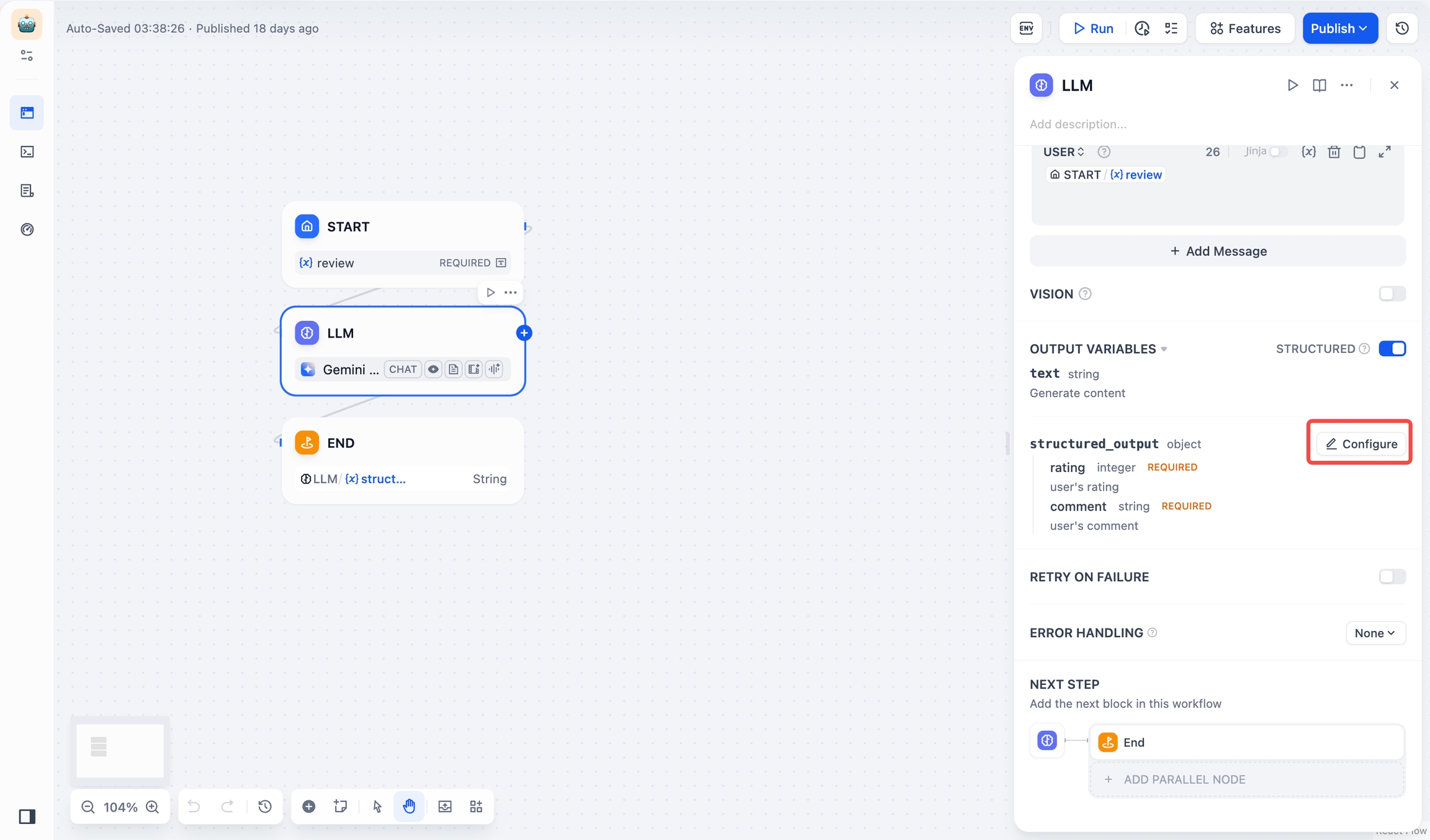 Structured Outputs: Ensures LLM returns data in a usable, stable, and predictable format, helping users to control exactly how their LLM nodes returns data.