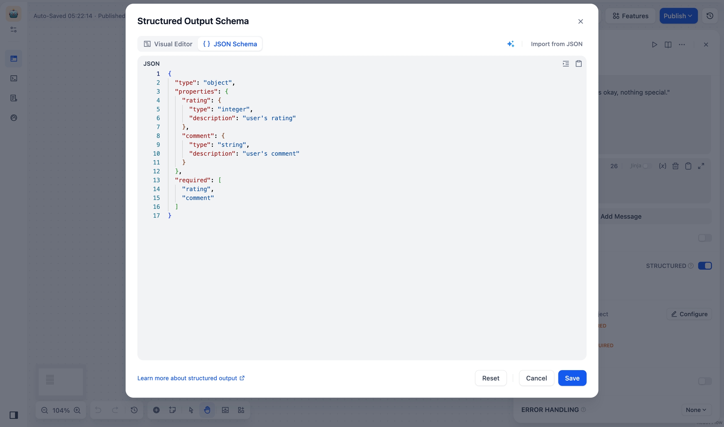 The JSON Schema Editor in LLM nodes lets you define how you want your data structured. You can use either the Visual Editor for a user-friendly experience or the JSON Schema for more precise control.