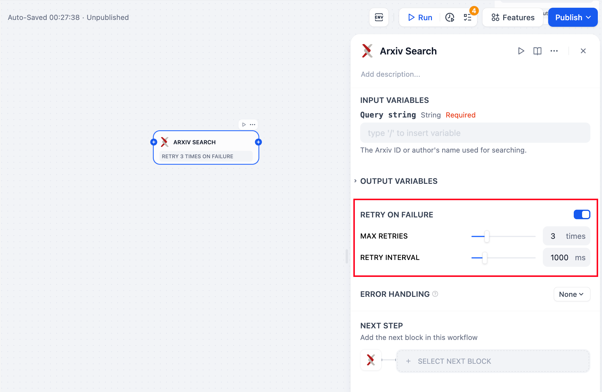 For some exceptions that occur in the node, it is usually sufficient to retry the node again. When the error retry function is enabled, the node will automatically retry according to the preset strategy when an error occurs. You can adjust the maximum number of retries and the interval between each retry to set the retry strategy.