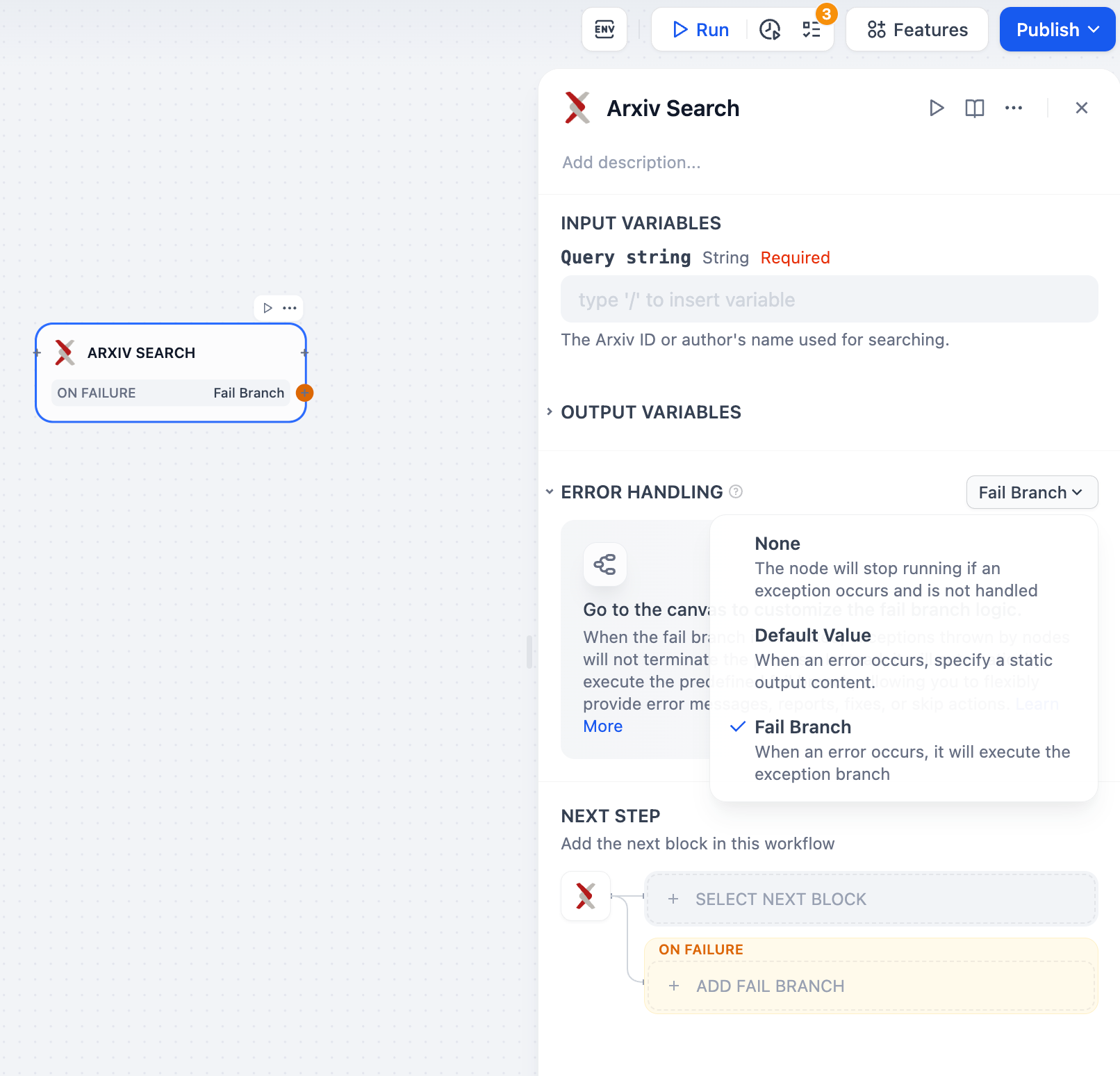Tool nodes may encounter errors during information processing that could interrupt the workflow. Developers can follow these steps to configure fail branches, enabling contingency plans when nodes encounter exceptions, avoiding workflow interruptions.