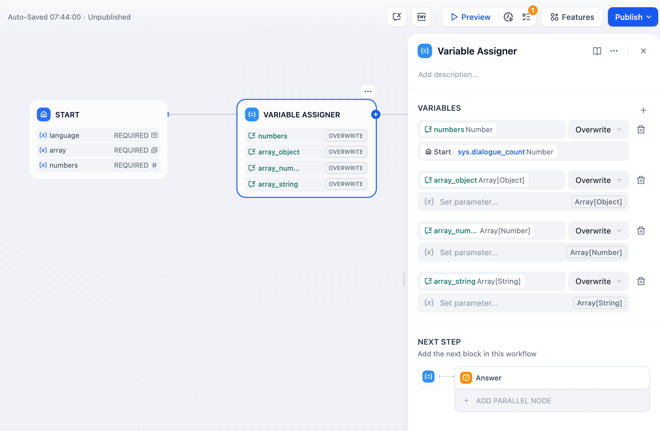 Array• Overwrite: Directly overwrite the target variable with the source variable. • Clear: Clear the contents of the selected target variable. • Append: Add a new element to the array in the target variable. • Extend: Add a new array to the target variable, effectively adding multiple elements at once.
