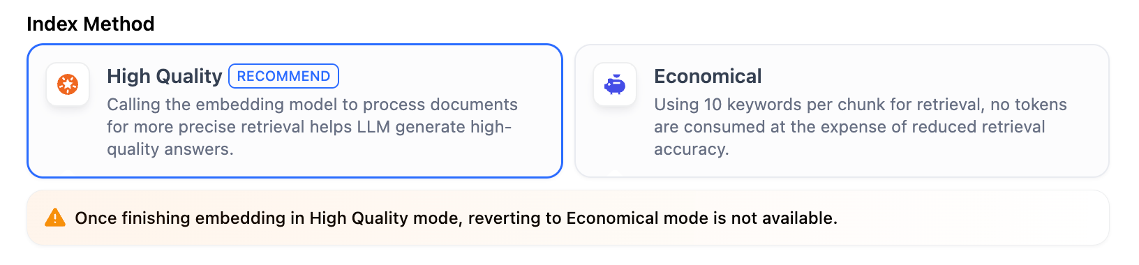注意:分割モードを選択し、ナレッジベースの作成を完了した後は、後からモードを変更することはできません。ナレッジベースにドキュメントを新たに追加する場合も、選択したコンテンツ分割戦略に従います。
