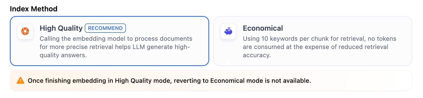 二層の構造を採用し、検索精度とコンテキスト情報のバランスを取ります。このモードでは、親セクション(Parent-chunk)がより大きなテキスト単位(例えば段落)を包含し、豊富なコンテキスト情報を提供します。子セクション(Child-chunk)はより小さなテキスト単位(例えば文)で、精確な検索に利用されます。システムは最初に子セクションを通じて精確な検索を行い関連性を確保した後、対応する親セクションを取得しコンテキスト情報を補完し、レスポンスを生成する際に正確さを保ちながら完全な背景情報を提供します。セクションの分割方法は、区切り文字と最大長さの設定を通してカスタマイズできます。