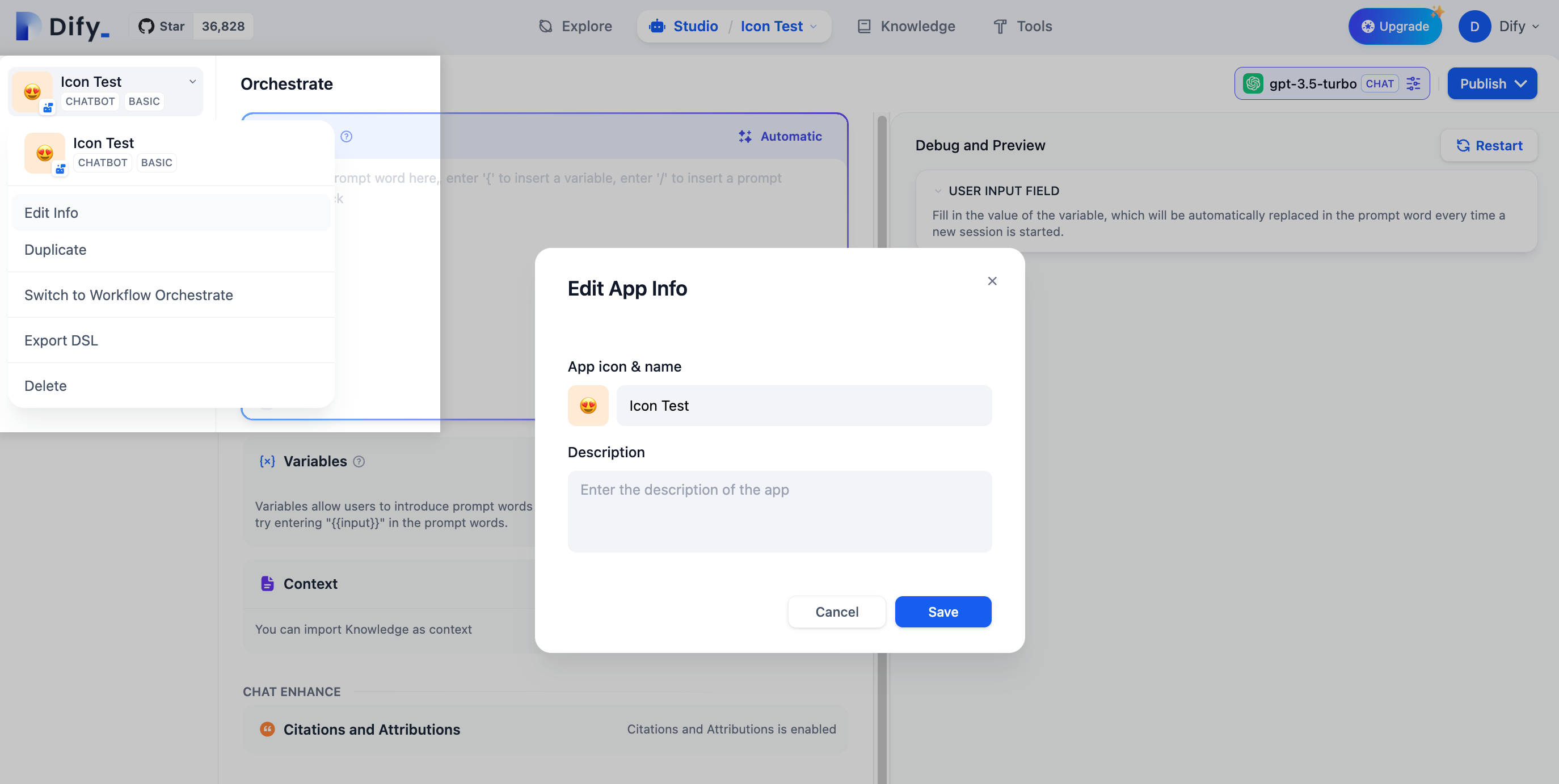 Difyで作成されたアプリはDSL形式でエクスポートをサポートしており、設定ファイルを任意のDifyチームに自由にインポートできます。 DSLファイルは次の2つの方法でエクスポートできます: