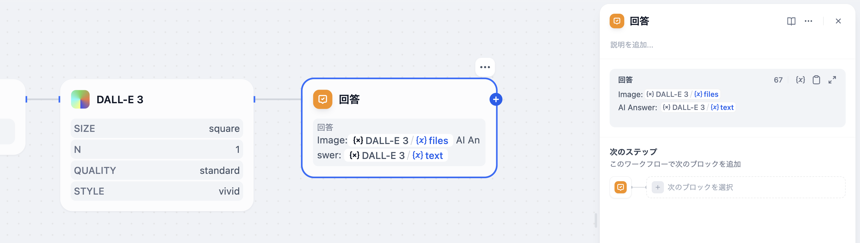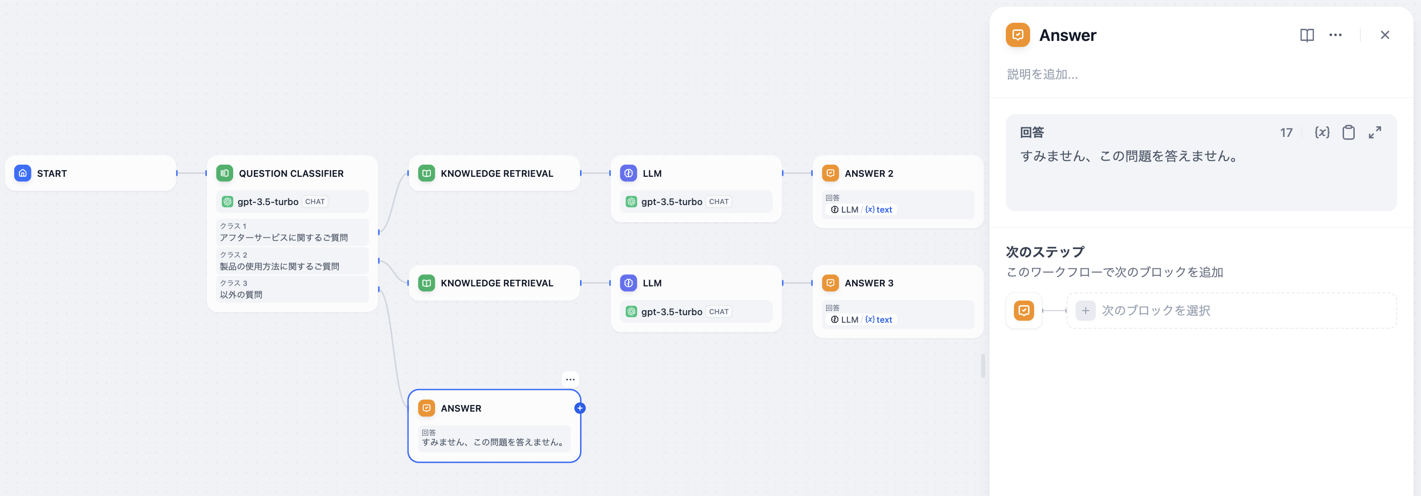 回答ノードは最終的な出力ノードとして使用しないこともでき、プロセスの中間ステップで結果をストリーミング形式で出力することができます。
