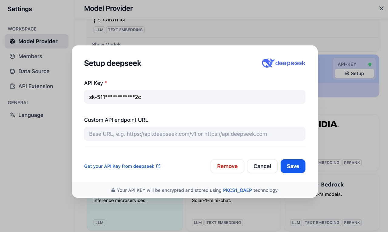 Go to the Dify platform and navigate to Profile → Settings → Model Providers. Locate DeepSeek, paste the API Key obtained earlier, and click Save. Once validated, you will see a success message.
