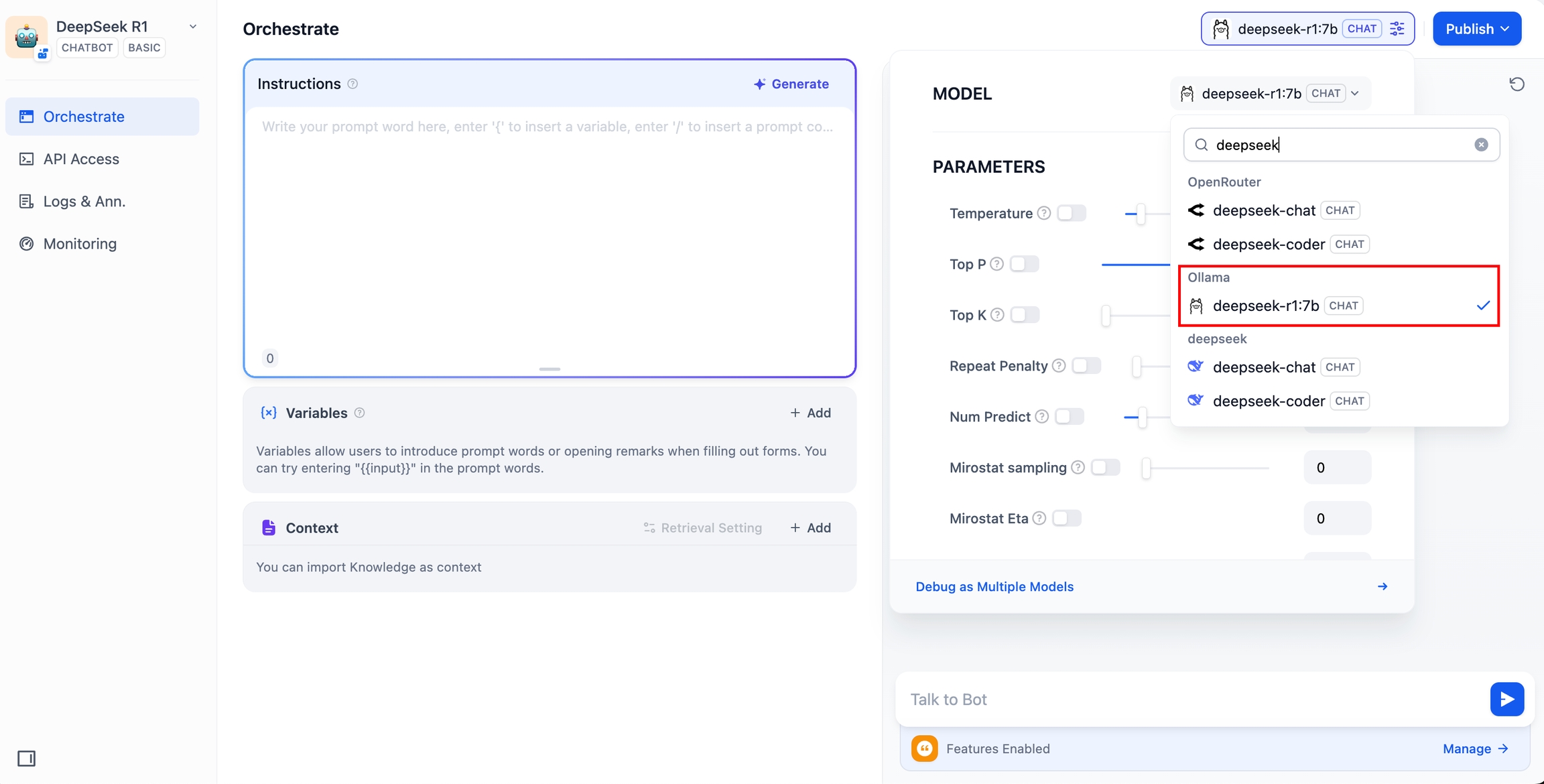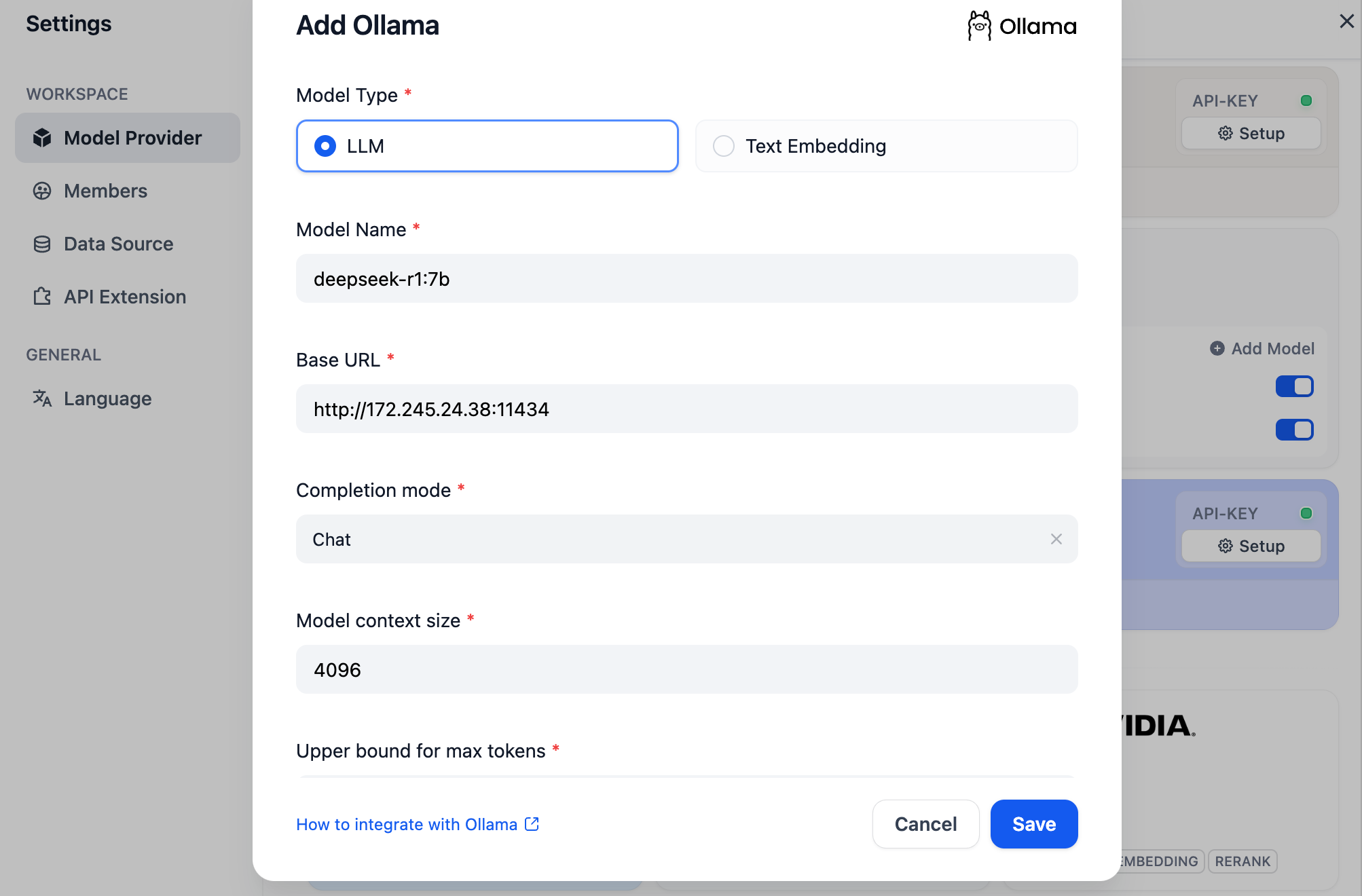 • Model Name: Enter the deployed model name, e.g., deepseek-r1:7b.