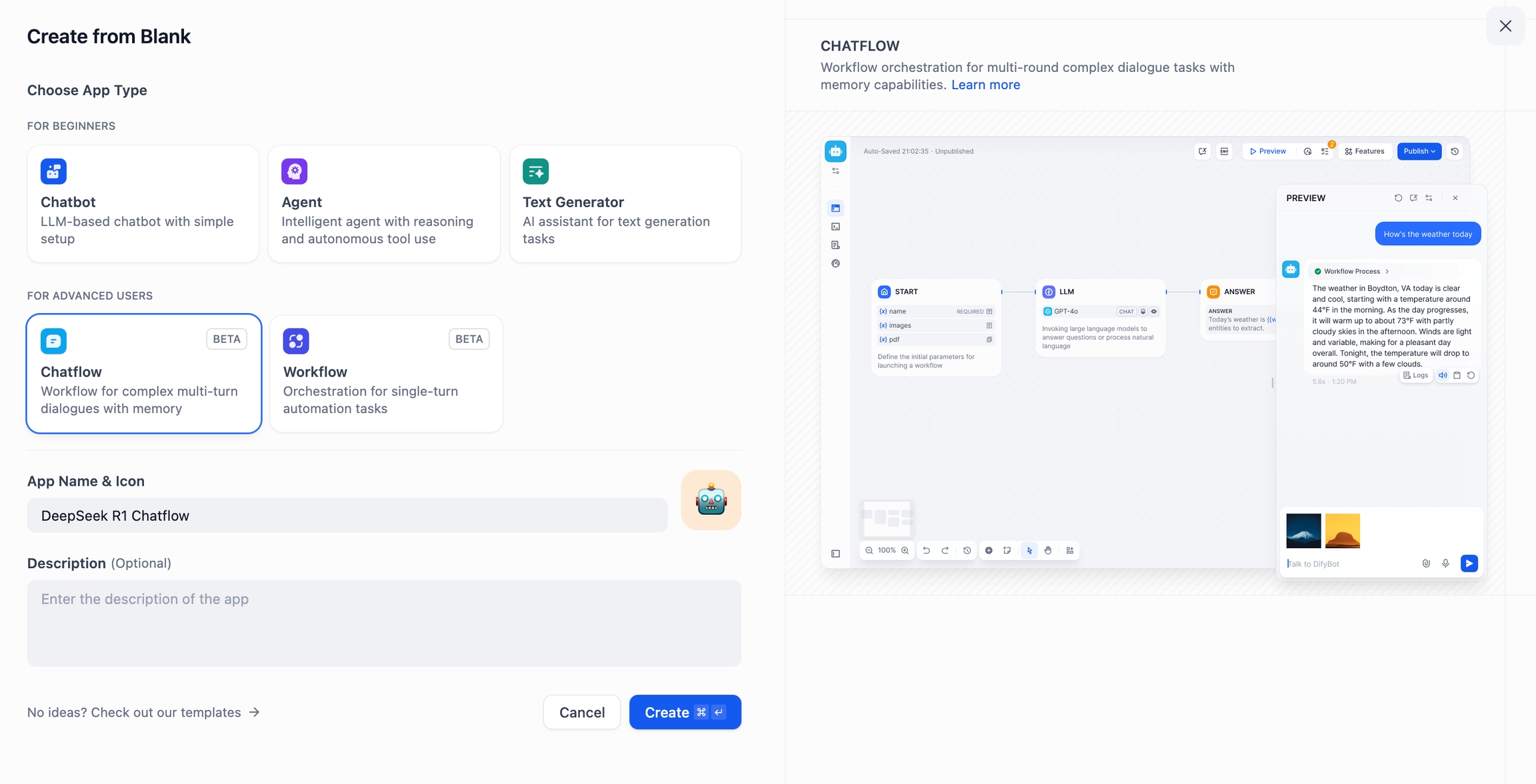 Click Create Blank App, then select Chatflow or Workflow, and name the application.