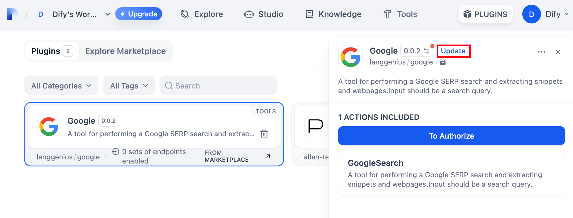 Click the "Plugins" button in the top right corner of the Dify platform, select the plugin that needs updating, and click the "Upgrade" button next to the plugin title.