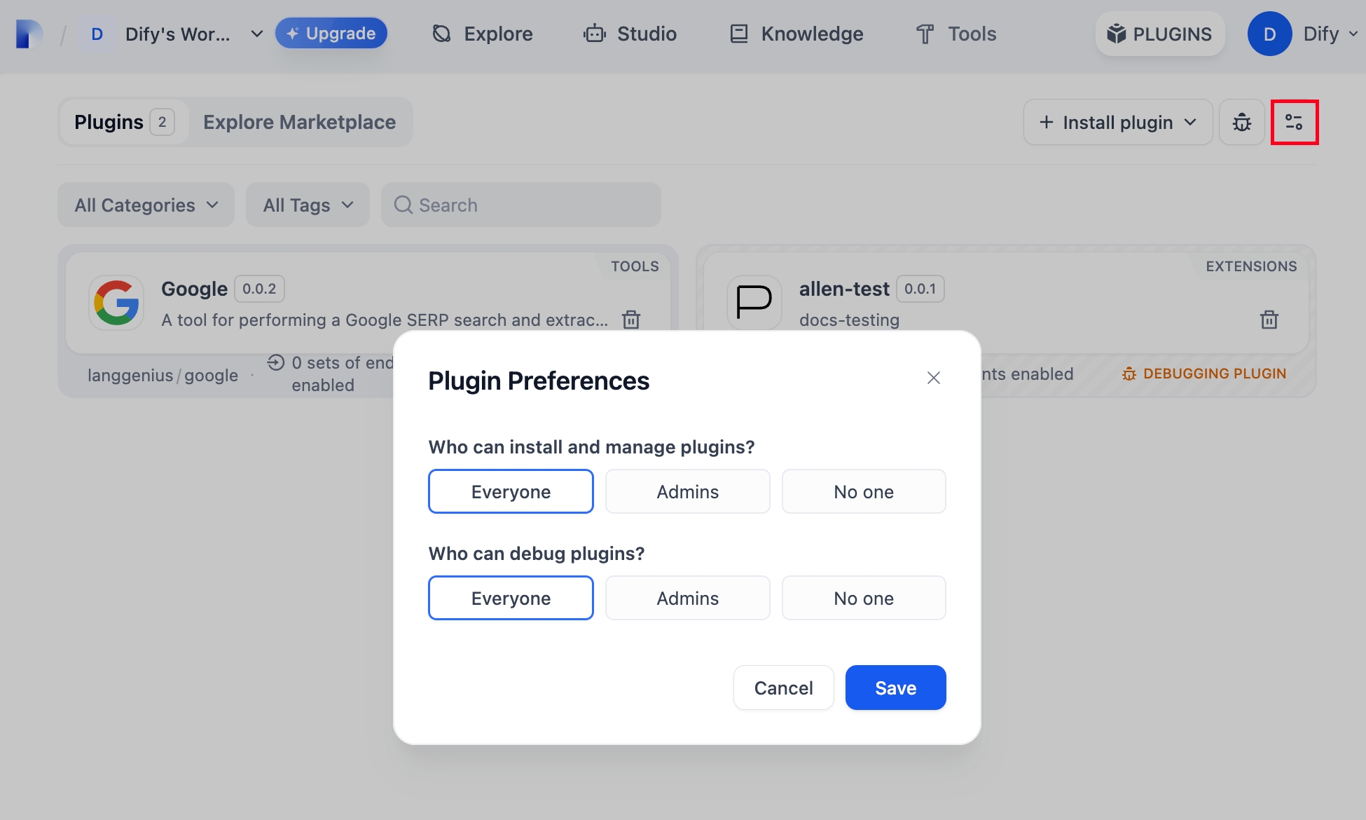 Team owners and administrators can control the following plugin permissions on the "Plugins" page in the top right corner of the Dify platform homepage: