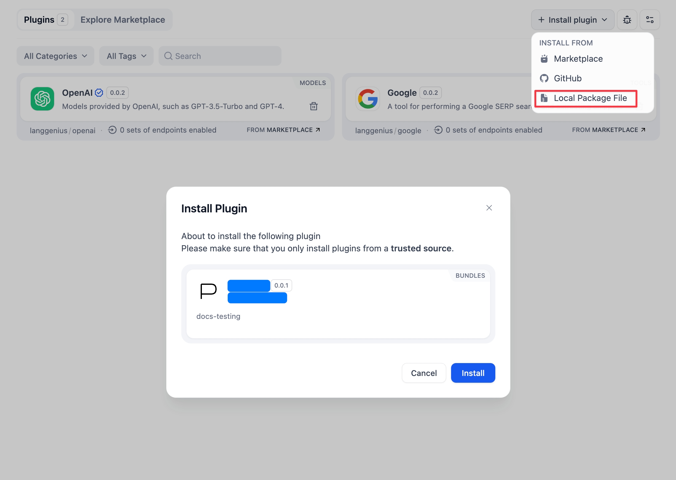 After completing plugin development, you can package your plugin project as a local file and share it with others. Once the plugin file is obtained, it can be installed into a Dify Workspace. This guide will show you how to package a plugin project as a local file and how to install plugins using local files.