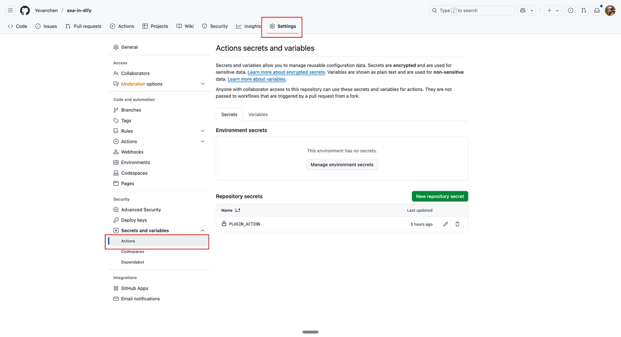 - Set up the - PLUGIN_ACTION Secretin your plugin source repository