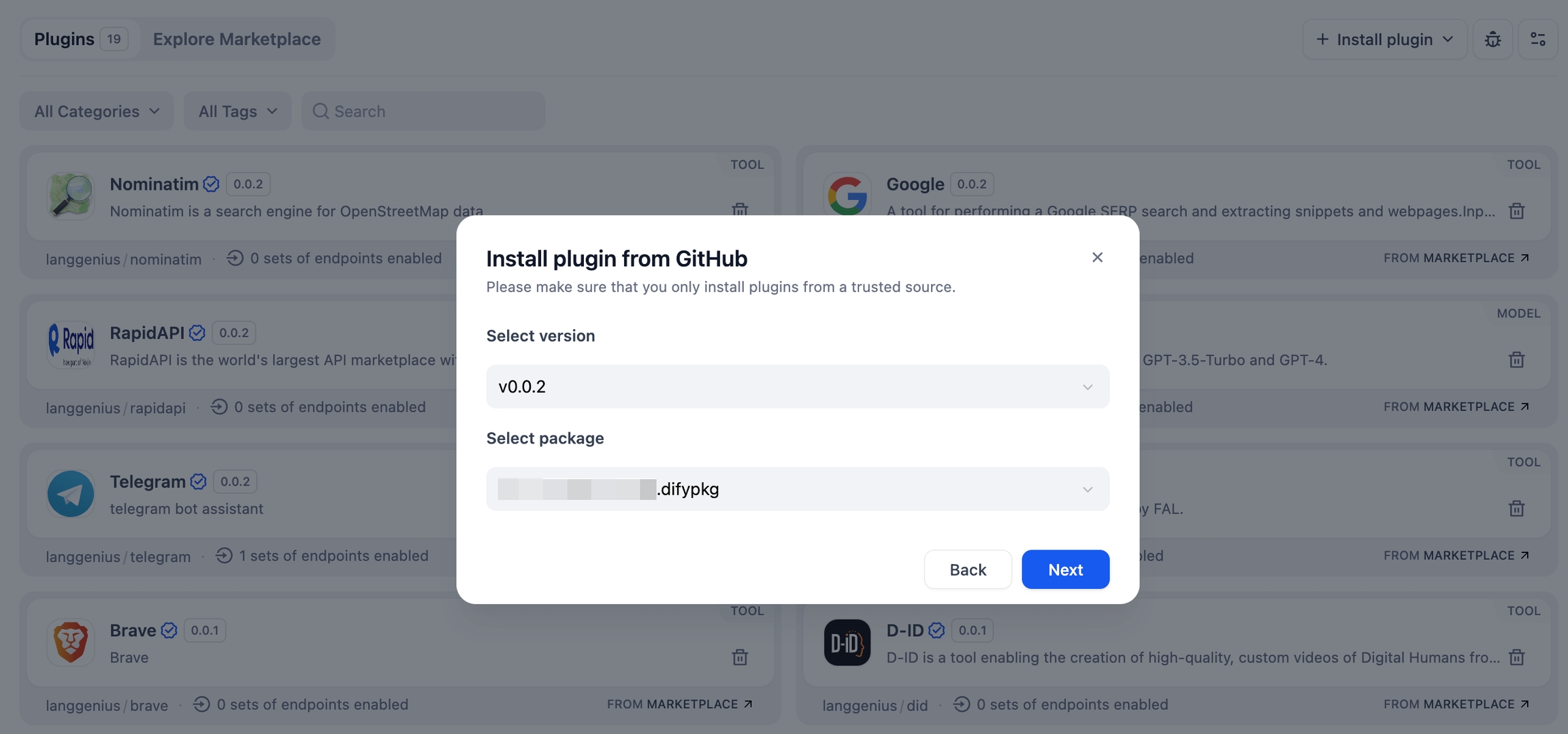 For detailed instructions on packaging plugins and obtaining .difypkg files, please refer to: Package Plugins