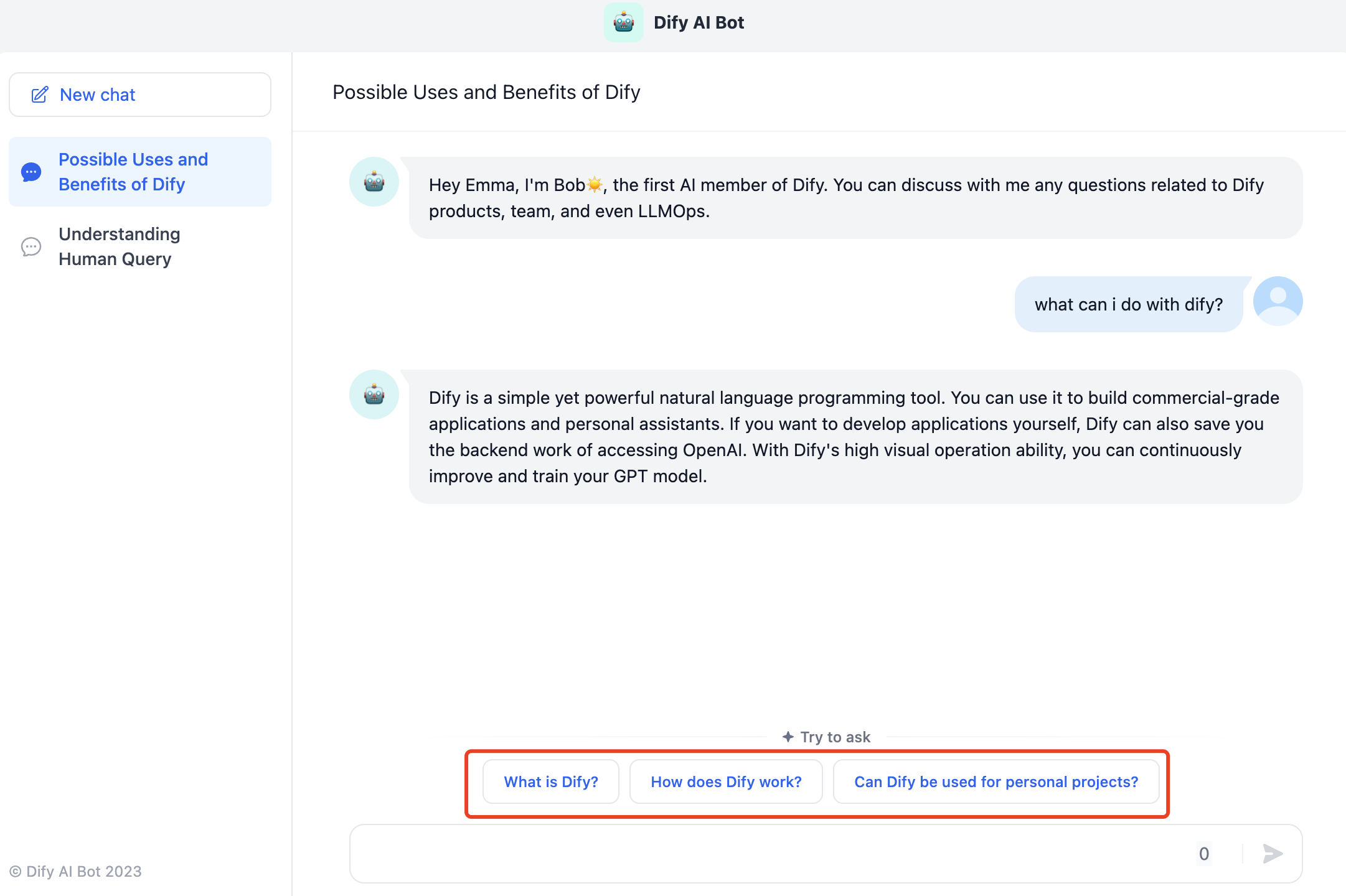 若在应用编排时开启了「下一步问题建议」功能，则在对话后系统自动生成 3 个相关问题建议：