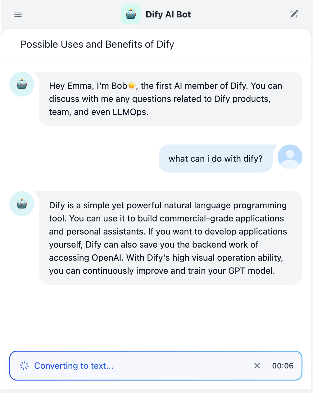 若在应用编排时开启了「语音转文字」功能，则在 Web 应用端的输入框看到语音输入的图标，点击图标即可语音输入转成文字：