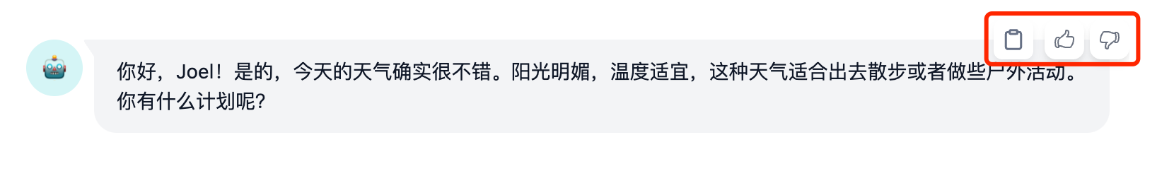 移动到 AI 的回答上，可以复制会话内容，给回答 “赞” 和 “踩”。